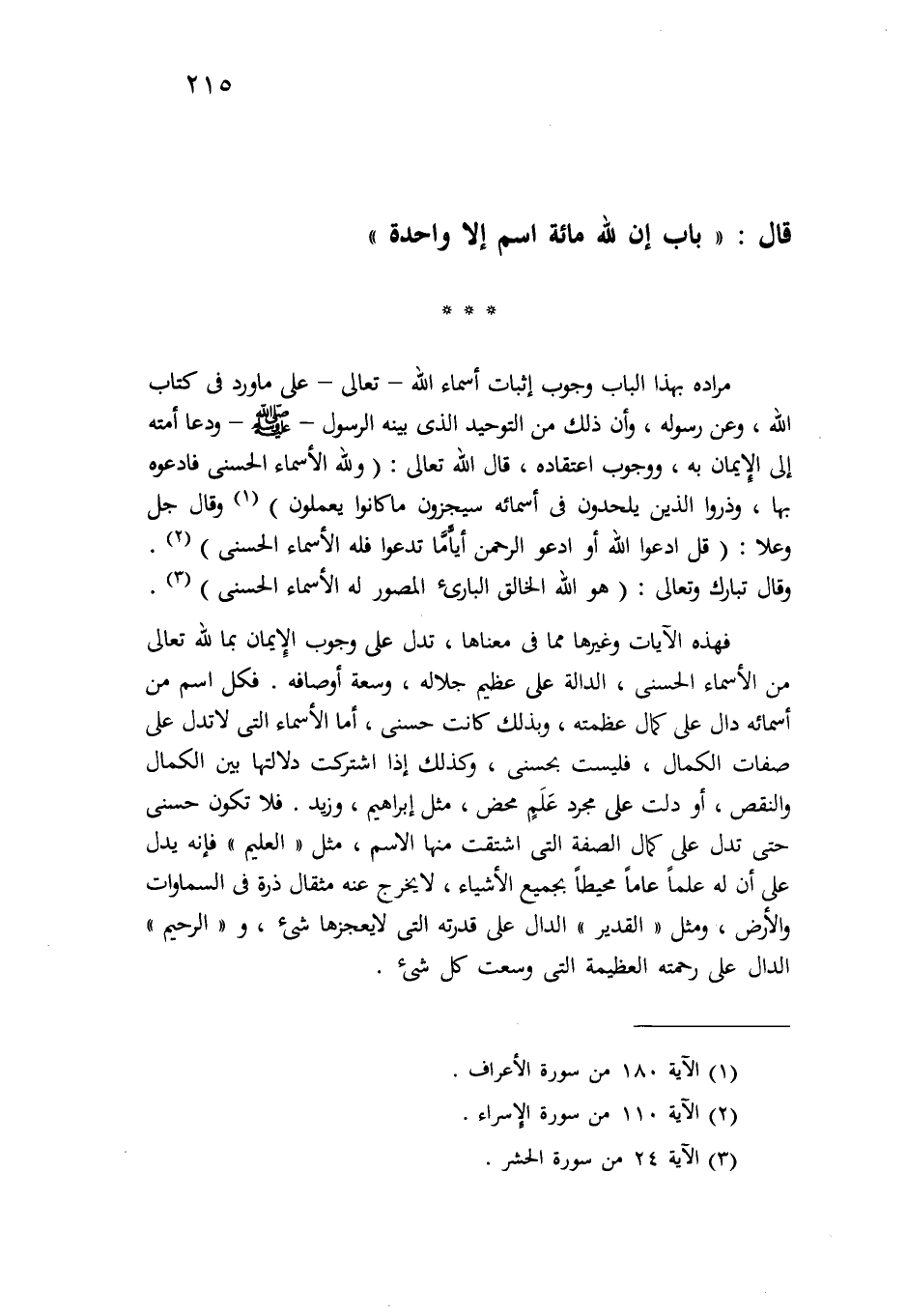 مراده بهذا الباب: وجوب إثبات أسماء الله -تعالى- على ما ورد في كتاب الله، وعن رسوله، وأن ذلك من التوحيد الذي بينه الرسول -صلى الله عليه وسلم- ودعا أمته إلى الإيمان به، ووجوب اعتقاده، قال الله -تعالى-: {وَلِلّهِ الأَسْمَاء الْحُسْنَى فَادْعُوهُ بِهَا وَذَرُواْ الَّذِينَ يُلْحِدُونَ فِي أَسْمَآئِهِ سَيُجْزَوْنَ مَا كَانُواْ يَعْمَلُونَ} (¬1) ، وقال - جل وعلا - {قُلِ ادْعُواْ اللهَ أَوِ ادْعُواْ الرَّحْمَنَ أَيًّا مَّا تَدْعُواْ فَلَهُ الأَسْمَاء الْحُسْنَى} (¬2) ، وقال - تبارك وتعالى-: {هُوَ اللَّهُ الْخَالِقُ الْبَارِئُ الْمُصَوِّرُ لَهُ الأَسْمَاء الْحُسْنَى} (¬3) .