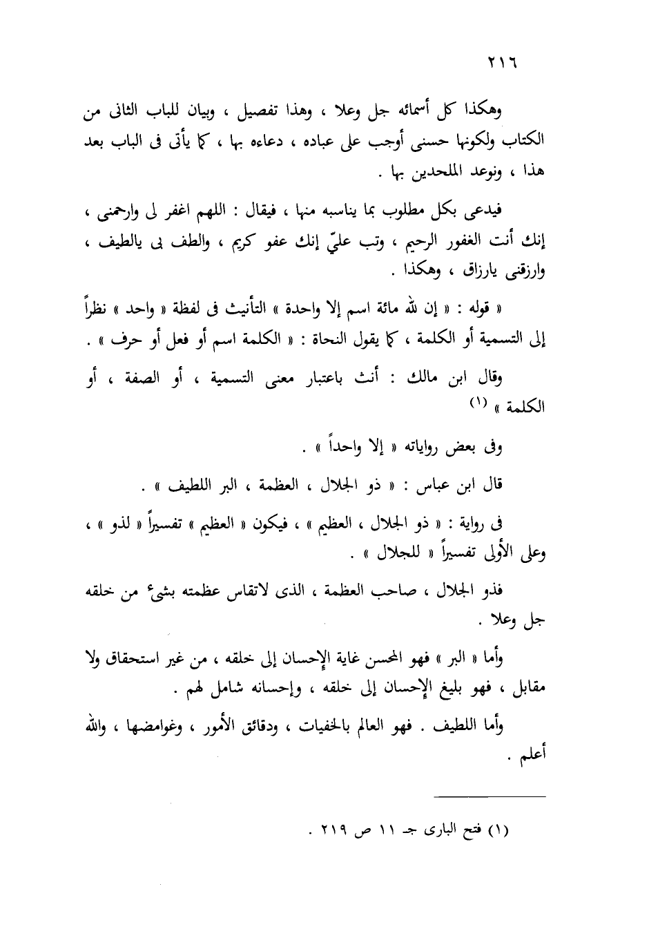 "قوله: " إن لله مائة اسم إلا واحدة" التأنيث في لفظة "واحد" نظراً إلى التسمية أو الكلمة، كما يقول النجاة: " الكلمة اسم أو فعل أو حرف".