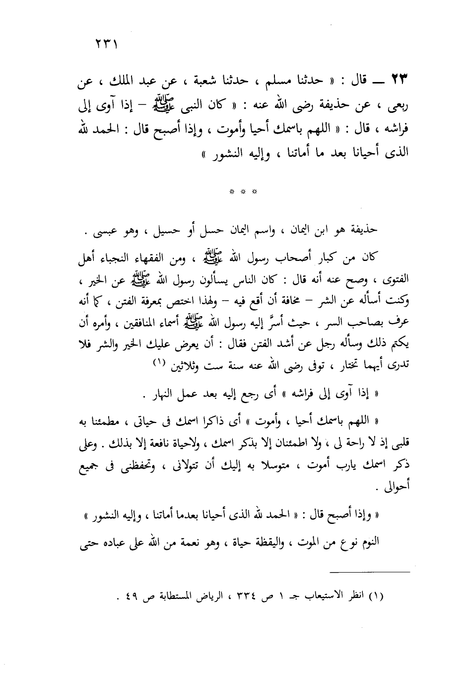 23-قال: " حدثنا مسلم، حدثنا شعبة، عن عبد الملك، عن ربعي، عن حذيفة - رضي الله عنه -: " كان النبي -صلى الله عليه وسلم- إذا أوى إلى فراشه، قال: " اللهم باسمك أحيا وأموت، وإذا أصبح قال: الحمد لله الذي أحيانا بعد ما أماتنا، وإليه النشور".