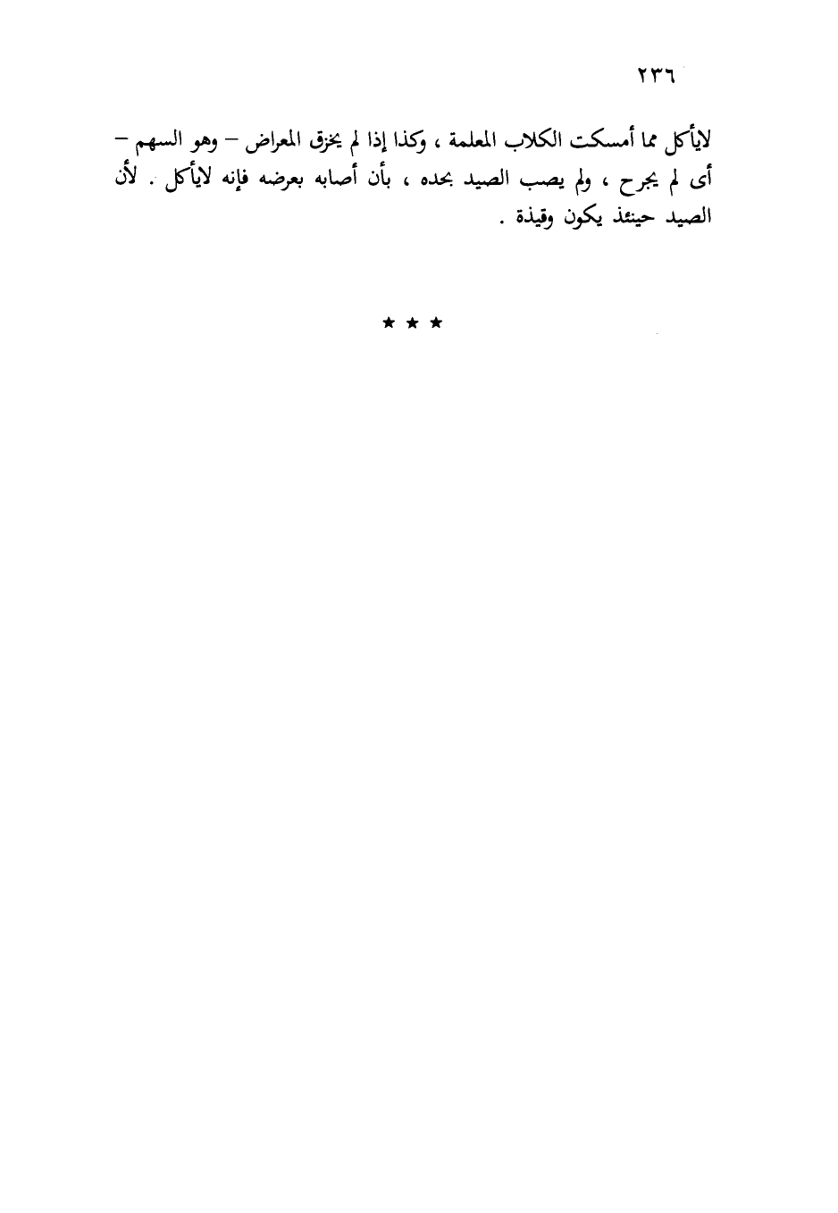 أنه لا يأكل مما أمسكت الكلاب المعلمة، وكذا إذا لم يخزق المعراض - وهو السهم - أي لم يجرح، ولم يصب الصيد بحده، بأن أصابه بعرضه، فإنه لا يأكل؛ لأن الصيد حينئذ يكون وقيذة.
