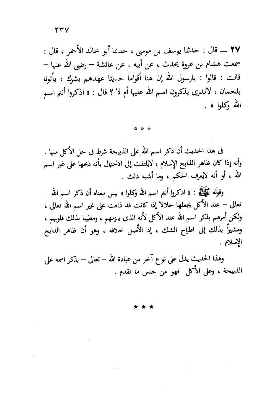 27- قال: " حدثنا يوسف بن موسى، حدثنا أبو خالد الأحمر، قال: سمعت هشام بن عروة يحدث: عن أبيه، عن عائشة - رضي الله عنها - قالت: قالوا: يا رسول الله، إن هنا أقواماً حديثاً عهدهم بشرك، يأتونا بلحمان، لا ندري يذكرون اسم الله عليها أم لا؟ قال: "اذكروا أنتم اسم الله وكلوا".