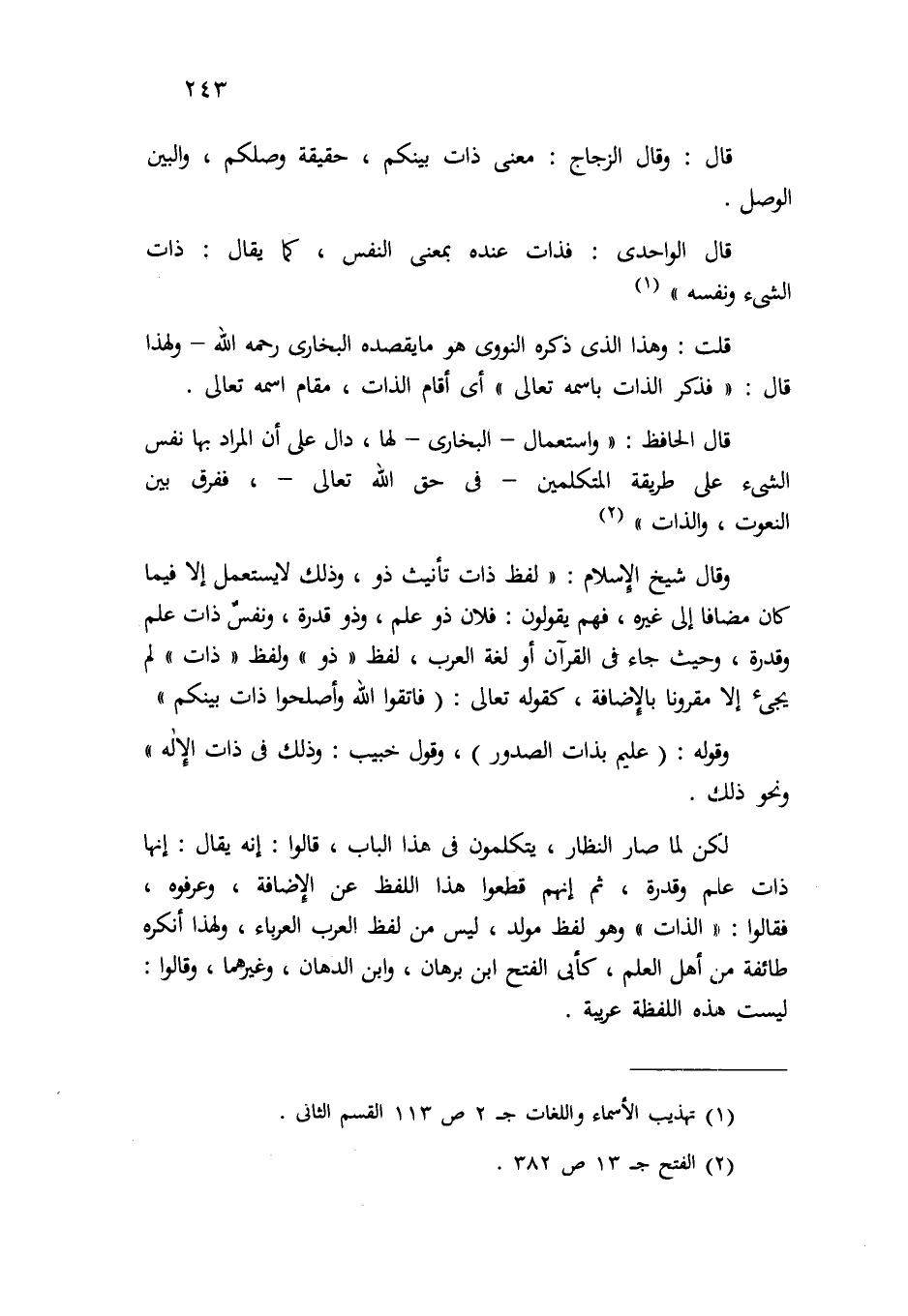 وقال شيخ الإسلام: " لفظ ذات تأنيث ذو، وذلك لا يستعمل إلا فيما كان مضافاً إلى غيره، فهم يقولون: فلان ذو علم، وذو قدرة، ونفس ذات علم وقدرة، وحيث جاء في القرآن أو لغة العرب، لفظ "ذو"، ولفظ "ذات" لم يجيء إلا مقروناً بالإضافة، كقوله -تعالى-: {فَاتَّقُواْ اللهَ وَأَصْلِحُواْ ذَاتَ بِيْنِكُم} ، وقوله: {عَلِيمٌ بِذَاتِ الصُّدُورِ} وقول خبيب: " وذلك في ذات الإله" ونحو ذلك.