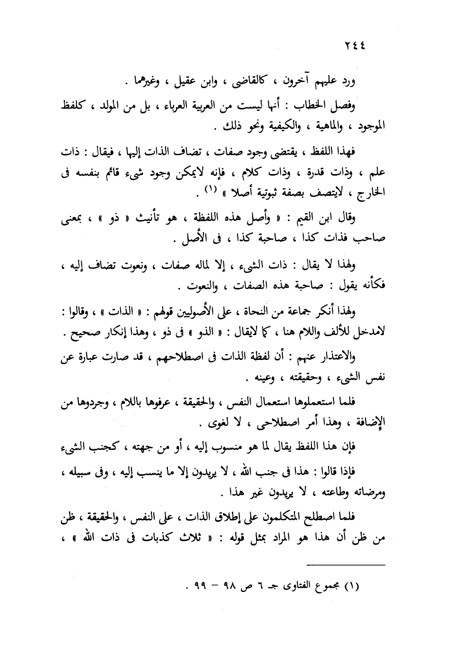 ولهذا أنكر جماعة من النحاة على الأصوليين قولهم: " الذات"، وقالوا: لا مدخل للألف واللام هنا، كما لا يقال: "الذو"، في ذو. وهذا إنكار صحيح.