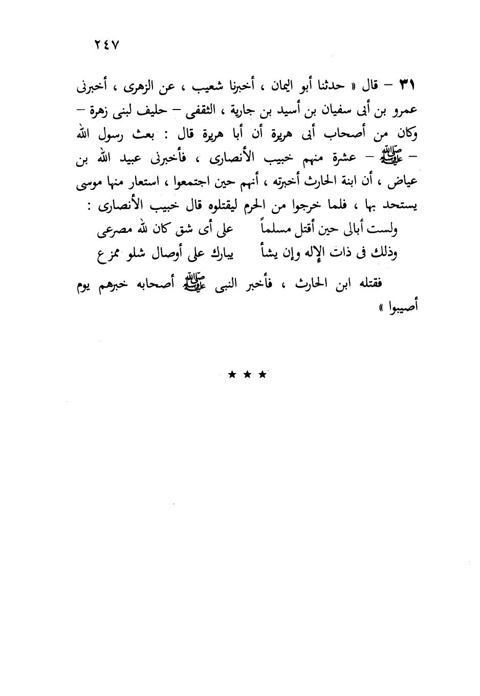 31- قال: " حدثنا أبو اليمان، أخبرنا شعيب، عن الزهري، أخبرني عمرو بن أبي سفيان بن أسيد بن جارية، الثقفي - حليف لبني زهرة، وكان من أصحاب أبي هريرة- أن أبا هريرة قال: بعث رسول الله -صلى الله عليه وسلم- عشرة، منهم خبيب الأنصاري فأخبرني عبيد الله بن عياض، أن ابنة الحارث أخبرته، أنهم حين اجتمعوا، استعار منها موسى يستحد بها، فلما خرجوا من الحرم ليقتلوه، قال خبيب الأنصاري: