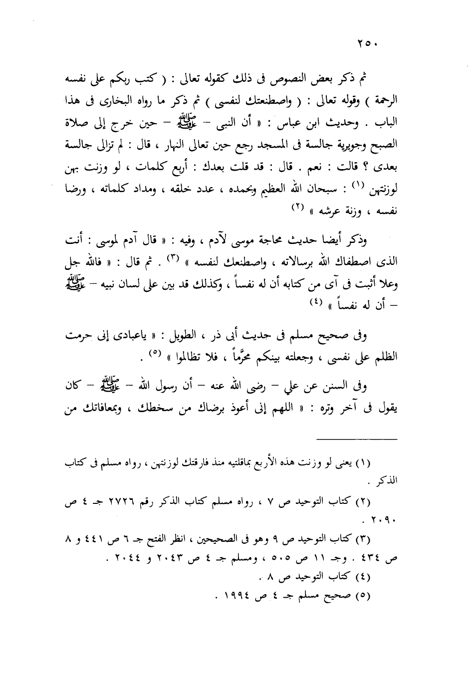 ثم ذكر بعض النصوص في ذلك كقوله -تعالى- {كَتَبَ رَبُّكُمْ عَلَى نَفْسِهِ الرَّحْمَةَ} وقوله -تعالى-: {وَاصْطَنَعْتُكَ لِنَفْسِي} ثم ذكر ما رواه البخاري في هذا الباب، وحديث ابن عباس: "أن النبي -صلى الله عليه وسلم- حين خرج إلى صلاة الصبح وجويرية جالسة في المسجد رجع حين تعالى النهار، قال: " لم تزالي جالسة بعدي؟ "