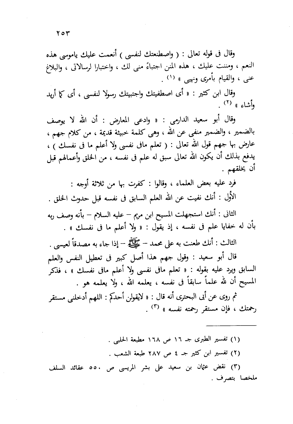 (¬3) نقض عثمان بن سعيد على بشر المريسي، (ص550) "عقائد السلف"، ملخصاً بتصرف.