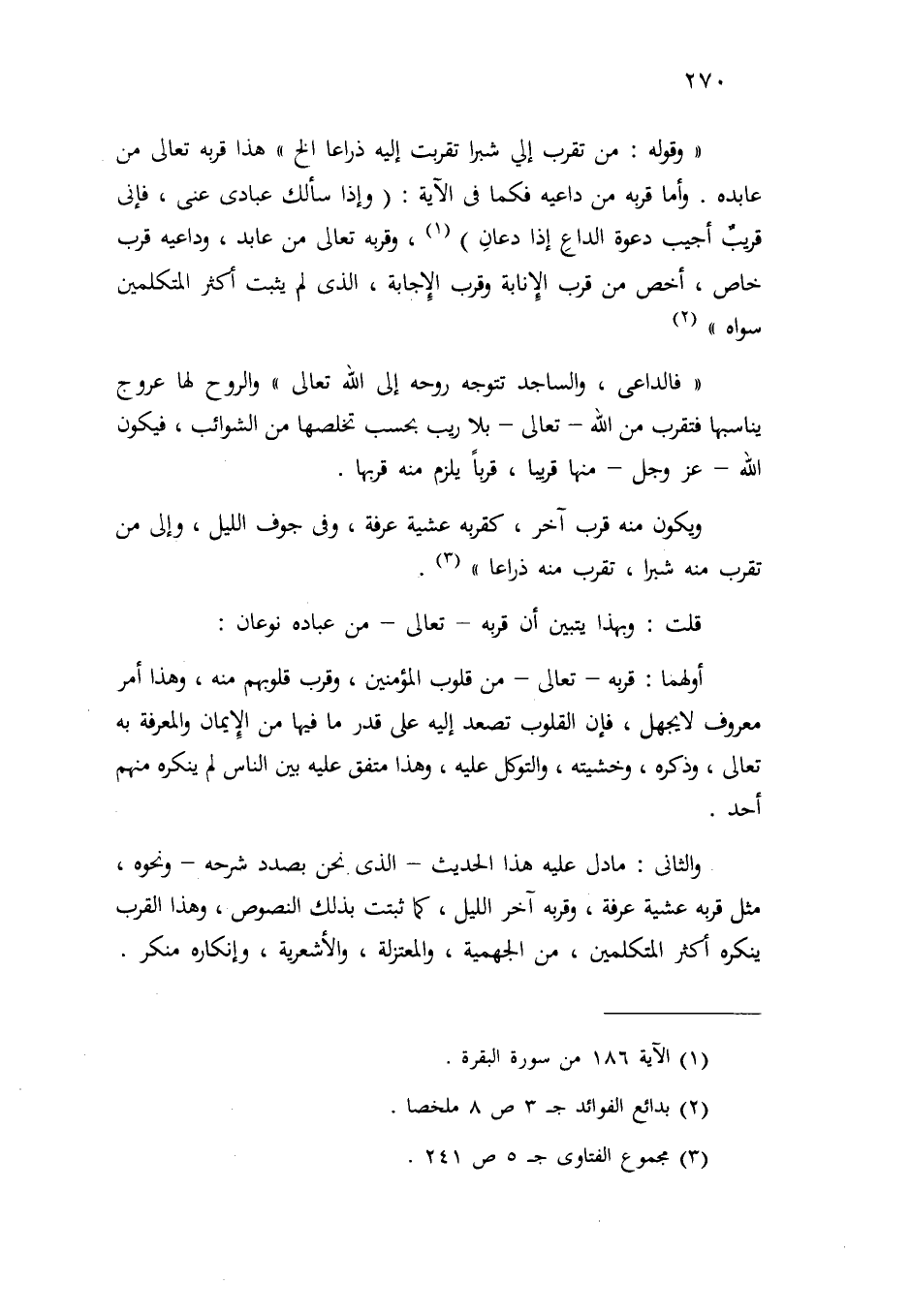 "وقوله: من تقرب إليَّ بشبر تقربت إليه ذراعاً ... " إلخ، هذا قربه -تعالى- من عابده، وأما قربه من داعيه فكما في الآية: {وَإِذَا سَأَلَكَ عِبَادِي عَنِّي فَإِنِّي قَرِيبٌ أُجِيبُ دَعْوَةَ الدَّاعِ إِذَا دَعَانِ} (¬1) ، وقربه تعالى من عابده وداعيه قرب خاص، أخص من قرب الإنابة وقرب الإجابة، الذي لم يثبت أكثر المتكلمين سواه" (¬2) .