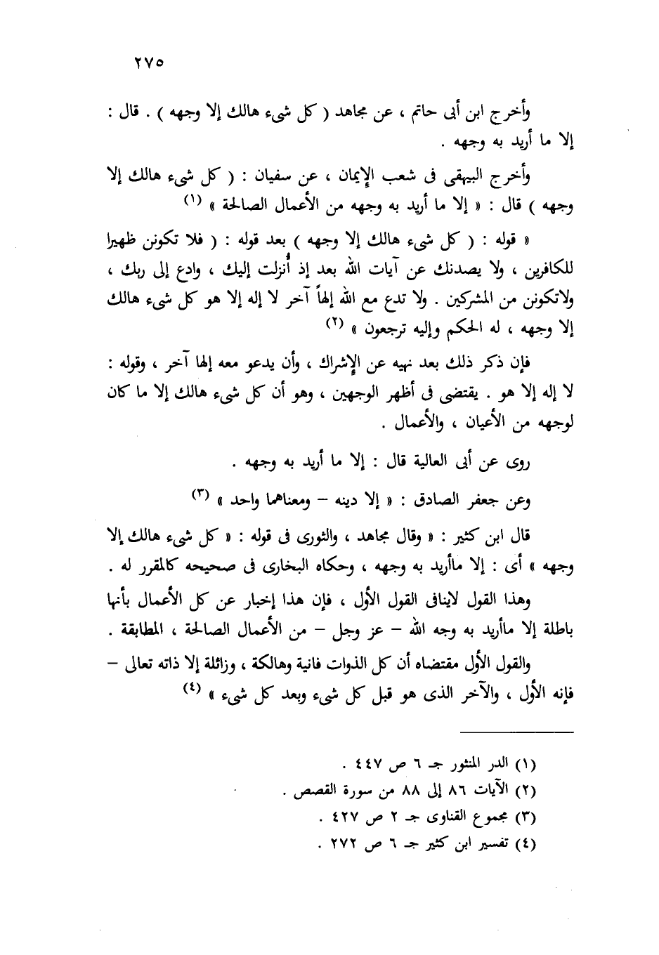 وأخرج البيهقي في "شعب الإيمان" عن سفيان: {كُلُّ شَيْءٍ هَالِكٌ إِلاَّ وَجْهَهُ} قال: إلا ما أريد به وجهه من الأعمال الصالحة " (¬1) .