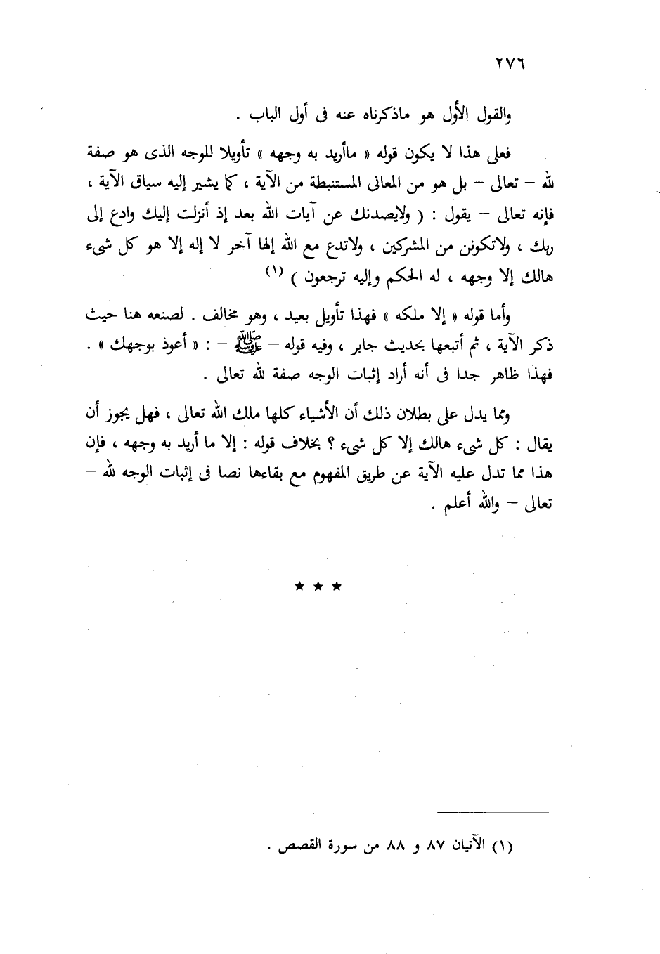 فعلى هذا لا يكون قوله: " ما أريد به وجهه" تأويلاً للوجه الذي هو صفة لله -تعالى-، بل هو من المعاني المستنبطة من الآية، كما يشير إليه سياق الآية، فإنه -تعالى- يقول: {وَلا يَصُدُّنَّكَ عَنْ آيَاتِ اللَّهِ بَعْدَ إِذْ أُنزِلَتْ إِلَيْكَ وَادْعُ إِلَى رَبِّكَ وَلا تَكُونَنَّ مِنَ الْمُشْرِكِينَ {87} وَلا تَدْعُ مَعَ اللَّهِ إِلَهًا آخَرَ لا إِلَهَ إِلاَّ هُوَ كُلُّ شَيْءٍ هَالِكٌ إِلاَّ وَجْهَهُ لَهُ الْحُكْمُ وَإِلَيْهِ تُرْجَعُونَ} (¬1) .