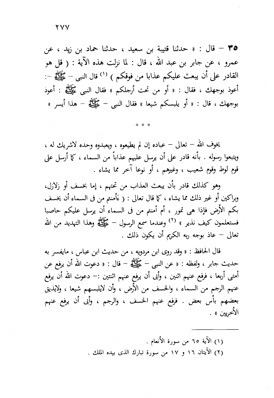 35-قال: " حدثنا قتيبة بن سعيد، حدثنا حماد بن زيد، عن عمرو، عن جابر بن عبد الله، قال: لما نزلت هذه الآية: {قُلْ هُوَ الْقَادِرُ عَلَى أَن يَبْعَثَ عَلَيْكُمْ عَذَابًا مِّن فَوْقِكُمْ} (¬1) ، قال النبي -صلى الله عليه وسلم- " أعوذ بوجهك"، فقال: {أَوْ مِن تَحْتِ أَرْجُلِكُمْ} فقال النبي -صلى الله عليه وسلم-: " أعوذ بوجهك"، قال {أَوْ يَلْبِسَكُمْ شِيَعاً} فقال النبي -صلى الله عليه وسلم-: "هذا أيسر".