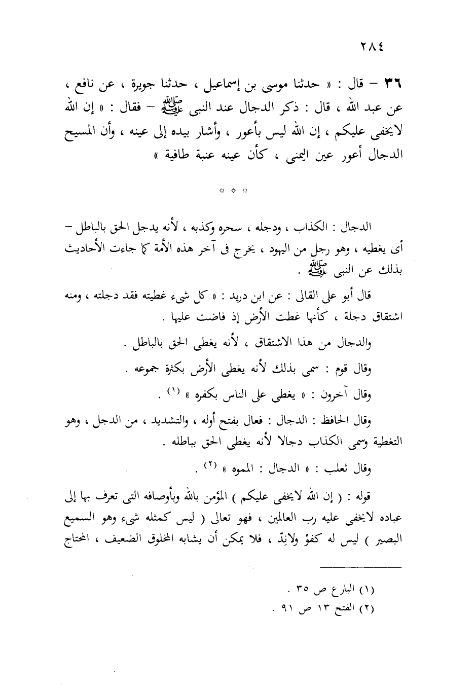 36- قال: " حدثنا موسى بن إسماعيل، حدثنا جويرية، عن نافع، عن عبد الله، قال: ذكر الدجال عند النبي -صلى الله عليه وسلم- فقال: " إن الله لا يخفى عليكم، إن الله ليس بأعور - وأشار بيده إلى عينه - وإن المسيح الدجال أعور عين اليمنى، كأن عينه عنبة طافية".