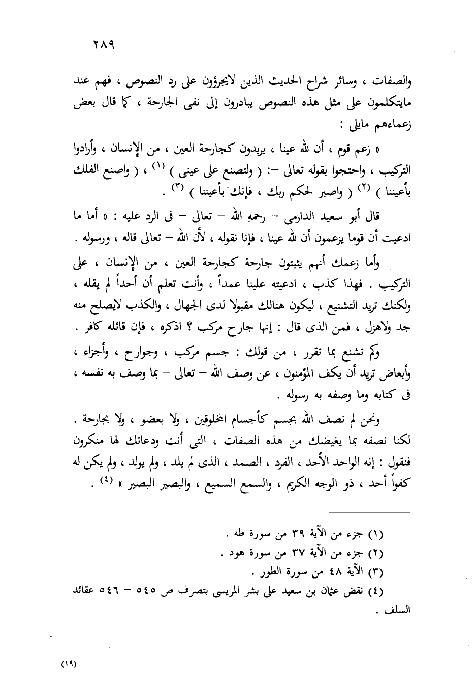(¬4) نقض عثمان بن سعيد على بشر المريسي، بتصرف (ص545-546) " عقائد السلف".