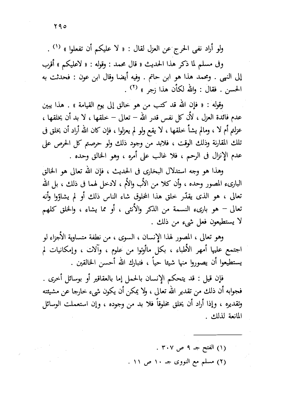 قوله: " فإن الله قد كتب من هو خالق إلى يوم القيامة" هذا يبين عدم فائدة العزل؛ لأن كل نفس قدر الله -تعالى- خلقها، لا بد أن يخلقها، عزلتم أم لا، وما لم يشأ خلقها لا يقع ولو لم يعزلوا، فإن كان الله أراد أن يخلق في تلك المقارنة وذلك الوقت، فلا بد من وجود ذلك ولو حرصتم كل الحرص على عدم الإنزال في الرحم، فلا غالب على أمره، وهو الخالق وحده.
