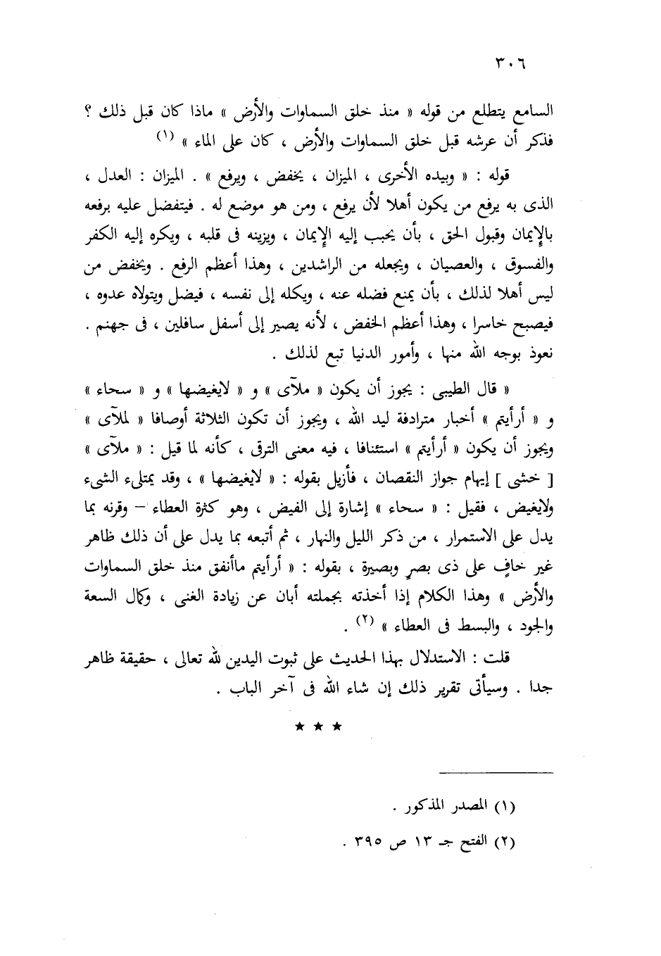 "قال الطيبي: يجوز أن يكون "ملأى" و"لا يغيضها" و"سحاء" و"أرأيتم" أخبار مترادفة ليد الله، ويجوز أن تكون الثلاثة أوصافاً "لملأى" ويجوز أن يكون "أرأيتم" استئنافاً فيه معنى الترقي، كأنه لما قيل: "ملأى" {خشي} إيهام جواز النقصان، فأزيل بقوله: " لا يغيضها" وقد يمتلئ الشيء ولا يغيض، فقيل: "سحاء" إشارة إلى الفيض - وهو كثرة العطاء - وقرنه بما يدل على الاستمرار، من ذكر الليل والنهار، ثم أتبعه بما يدل على أن ذلك ظاهر غير خاف على ذي بصر وبصيرة، بقوله: " أرأيتم ما أنفق منذ خلق السماوات والأرض" وهذا الكلام إذا أخذته بجملته أبان عن زيادة الغنى، وكمال السعة والجود، والبسط في العطاء" (¬2) .