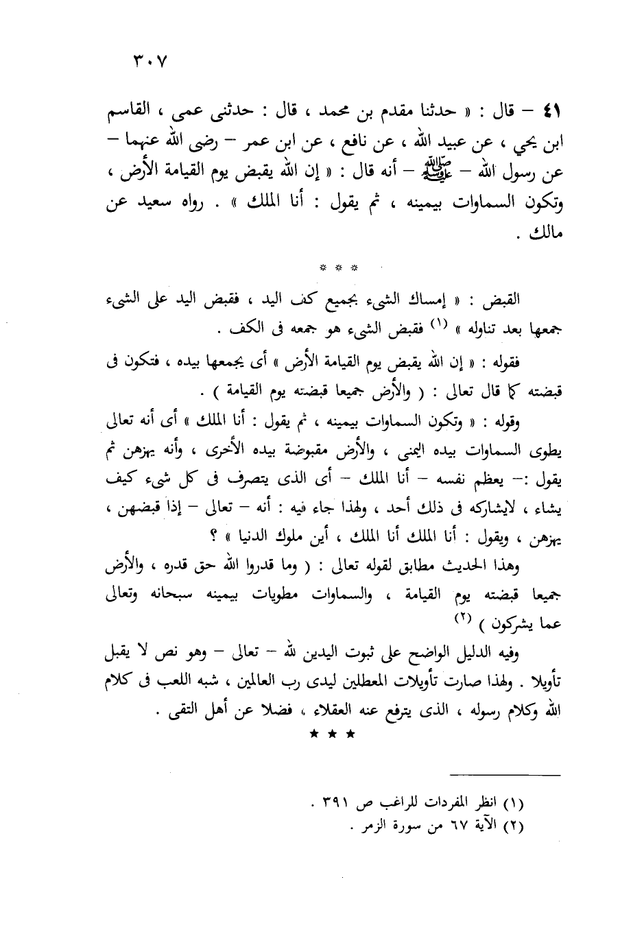 وهذا الحديث مطابق لقوله -تعالى-: {وَمَا قَدَرُوا اللَّهَ حَقَّ قَدْرِهِ وَالأَرْضُ جَمِيعًا قَبْضَتُهُ يَوْمَ الْقِيَامَةِ وَالسَّماوَاتُ مَطْوِيَّاتٌ بِيَمِينِهِ سُبْحَانَهُ وَتَعَالَى عَمَّا يُشْرِكُونَ} (¬2) .
