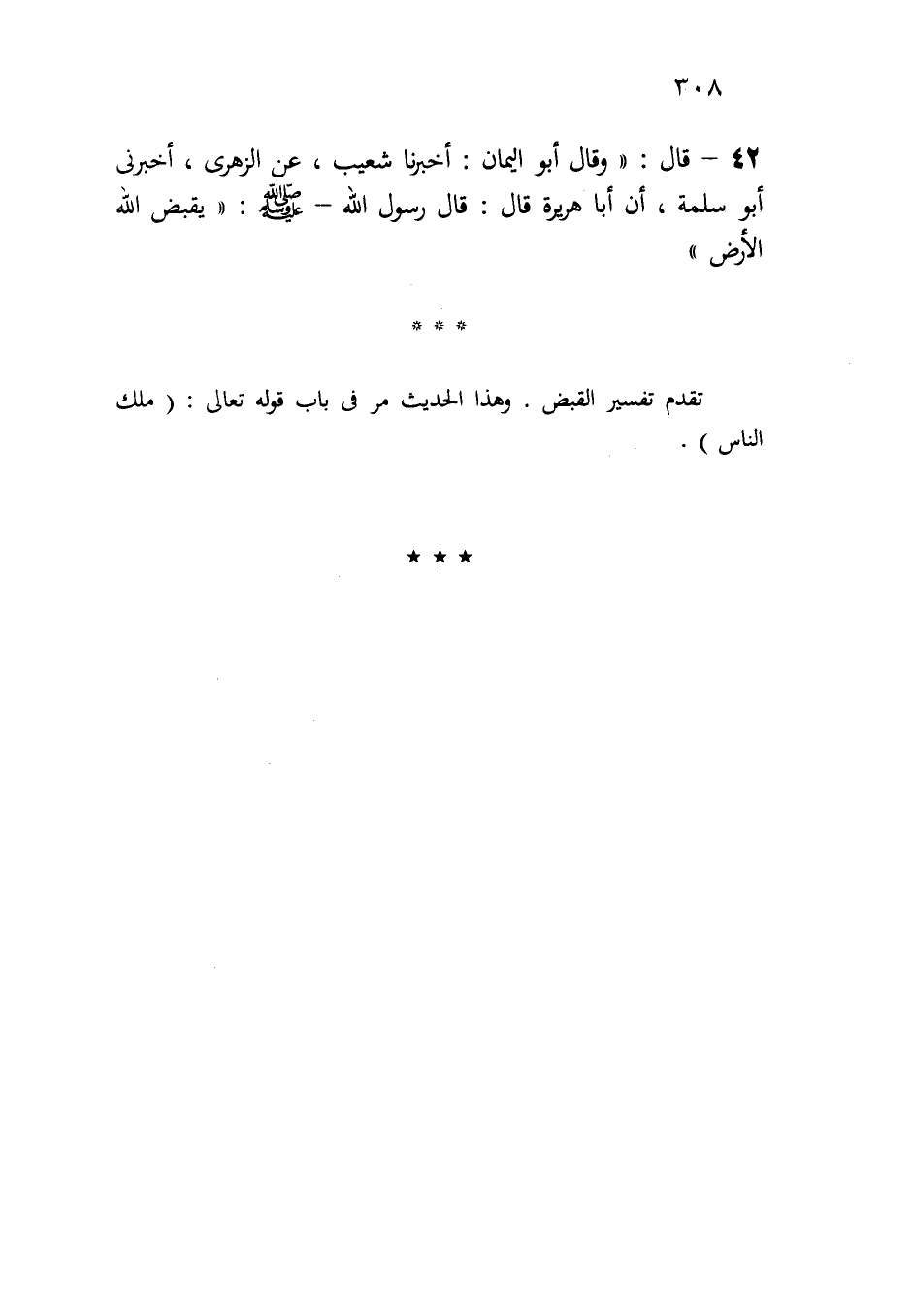 42-قال: " وقال أبو اليمان: أخبرنا شعيب، عن الزهري، أخبرني أبو سلمة، أن أبا هريرة قال: قال رسول الله -صلى الله عليه وسلم-: " يقبض الله الأرض ".
