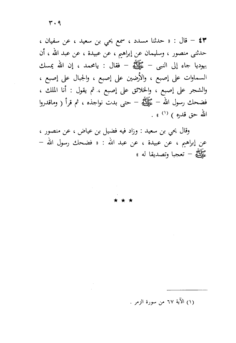 43-قال: " حدثنا مسدد، سمع يحيى بن سعيد، عن سفيان، حدثني منصور، وسليمان، عن إبراهيم، عن عبيدة، عن عبد الله، أن يهودياً جاء إلى النبي -صلى الله عليه وسلم- فقال: يا محمد، إن الله يمسك السماوات على إصبع، والأرضيين على إصبع، والجبال على إصبع، والشجر على إصبع، والخلائق على إصبع، ثم يقول: أنا الملك، فضحك رسول الله -صلى الله عليه وسلم- حتى بدت نواجذه، ثم قرأ: {وَمَا قَدَرُوا اللَّهَ حَقَّ قَدْرِهِ} (¬1) ".