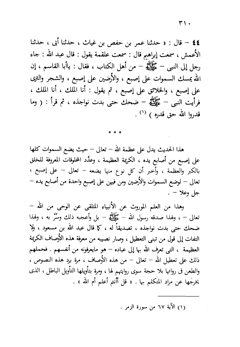 44-قال: " حدثنا عمر بن حفص عن غياث، حدثنا أبي، حدثنا الأعمش، سمعت إبراهيم قال: سمعت علقمة يقول: قال عبد الله: جاء رجل إلى النبي -صلى الله عليه وسلم- من أهل الكتاب، فقال: يا أبا القاسم، إن الله يمسك السموات على إصبع، والأرضيين على إصبع، والشجر والثرى على إصبع، والخلائق على إصبع، ثم يقول: أن الملك، أنا الملك، فرأيت النبي -صلى الله عليه وسلم- ضحك حتى بدت نواجذه، ثم قرأ: {وَمَا قَدَرُوا اللَّهَ حَقَّ قَدْرِهِ} ".