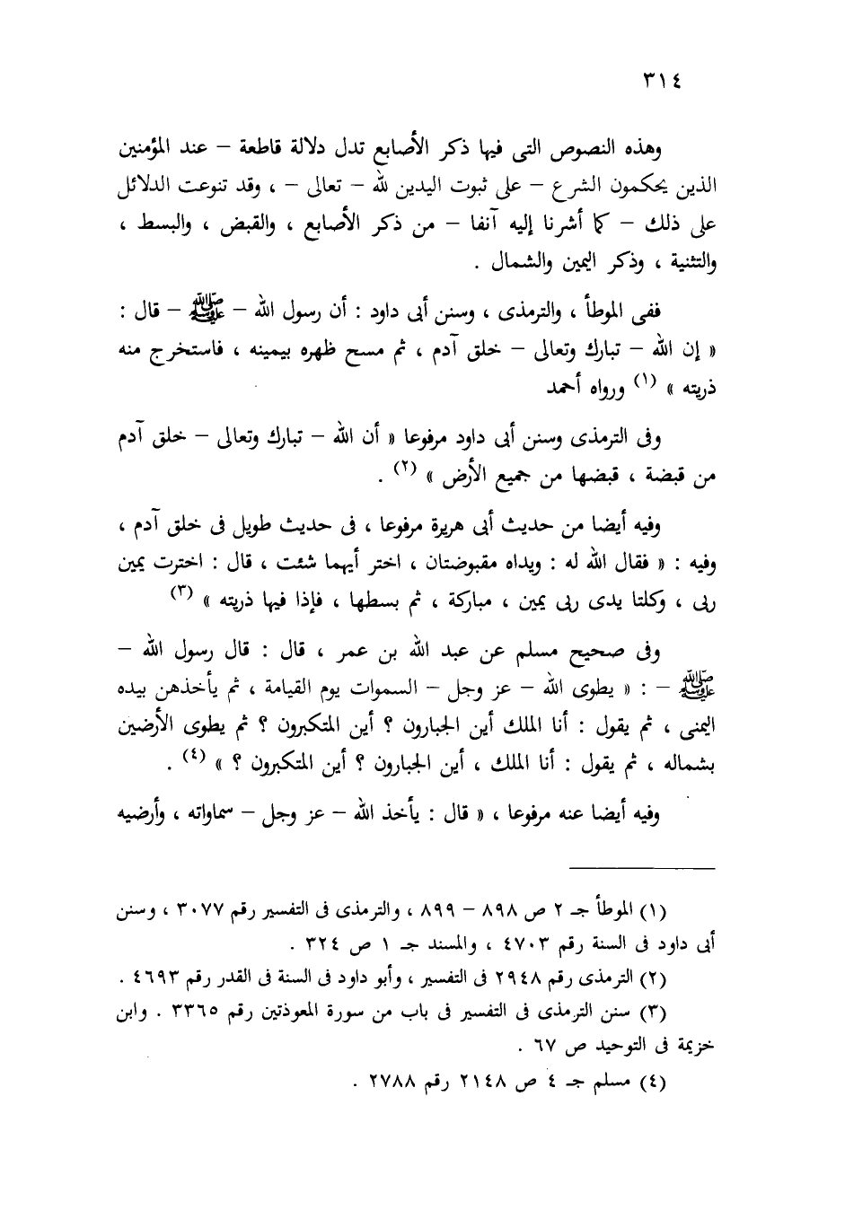 وهذه النصوص التي فيها ذكر الأصابع تدل دلالة قاطعة - عند المؤمنين الذين يحكمون الشرع - على ثبوت اليدين لله - تعالى -، وقد تنوعت الدلائل على ذلك - كما أشرنا إليه آنفا - من ذكر الأصابع، والقبض، والبسط، والتثنية، وذكر اليمين والشمال.