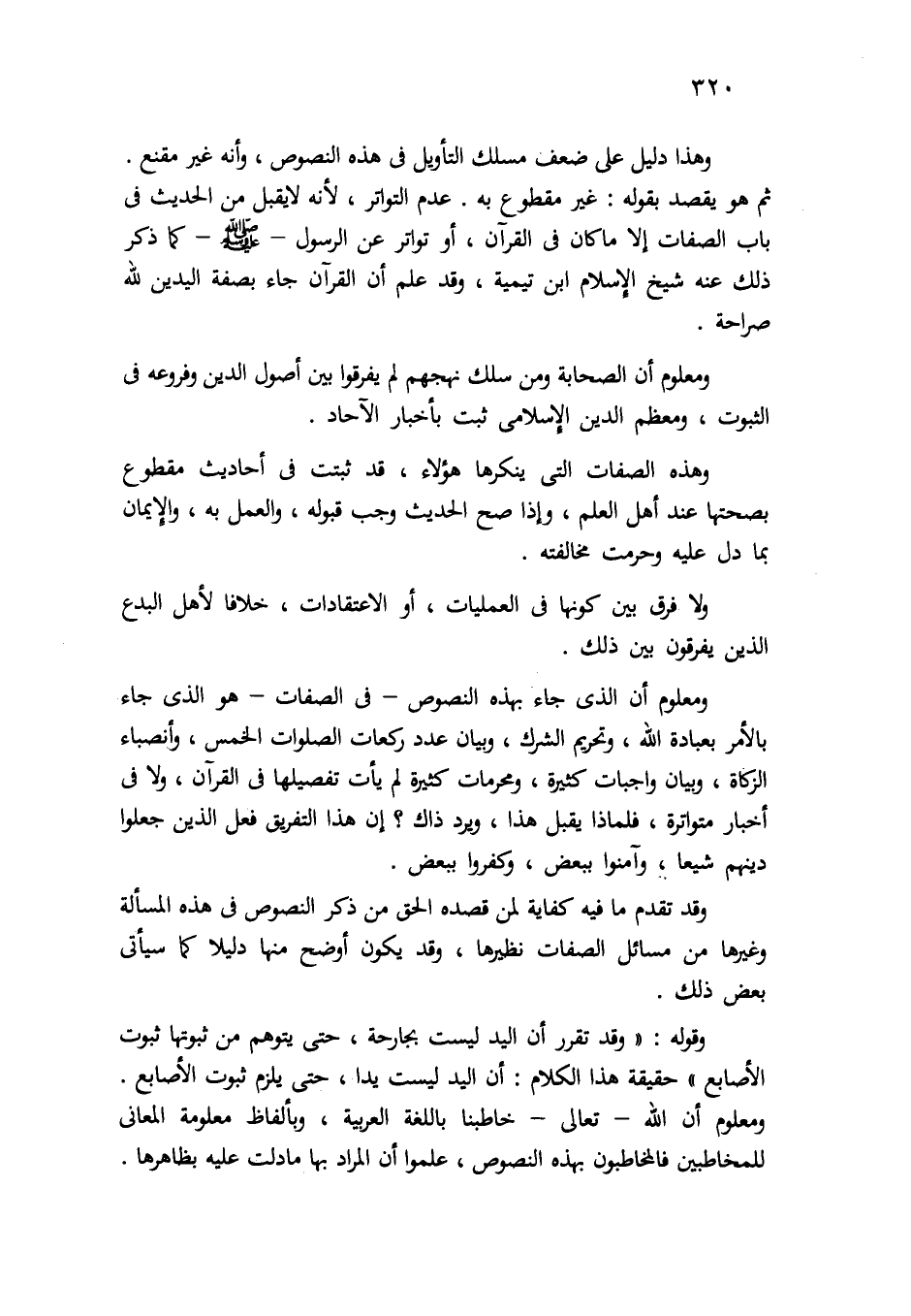 ومعلوم أن الذي جاء بهذه النصوص – في الصفات – هو الذي جاء بالأمر بعبادة الله، وتحريم الشرك، وبيان عدد ركعات الصلوات الخمس، وأنصباء الزكاة، وبيان واجبات كثيرة، ومحرمات كثيرة، لم يأت تفصيلها في القرآن، ولا في أخبار متواترة، فلماذا يقبل هذا، ويرد ذاك؟ إن هذا التفريق فعل الذين جعلوا دينهم شيعاً، وآمنوا ببعض، وكفروا ببعض، وقد تقدم ما فيه كفاية لمن قصده الحق من ذكر النصوص في هذه المسألة، وغيرها من مسائل الصفات نظيرها، وقد يكون أوضح منها دليلاً كما سيأتي بعض ذلك