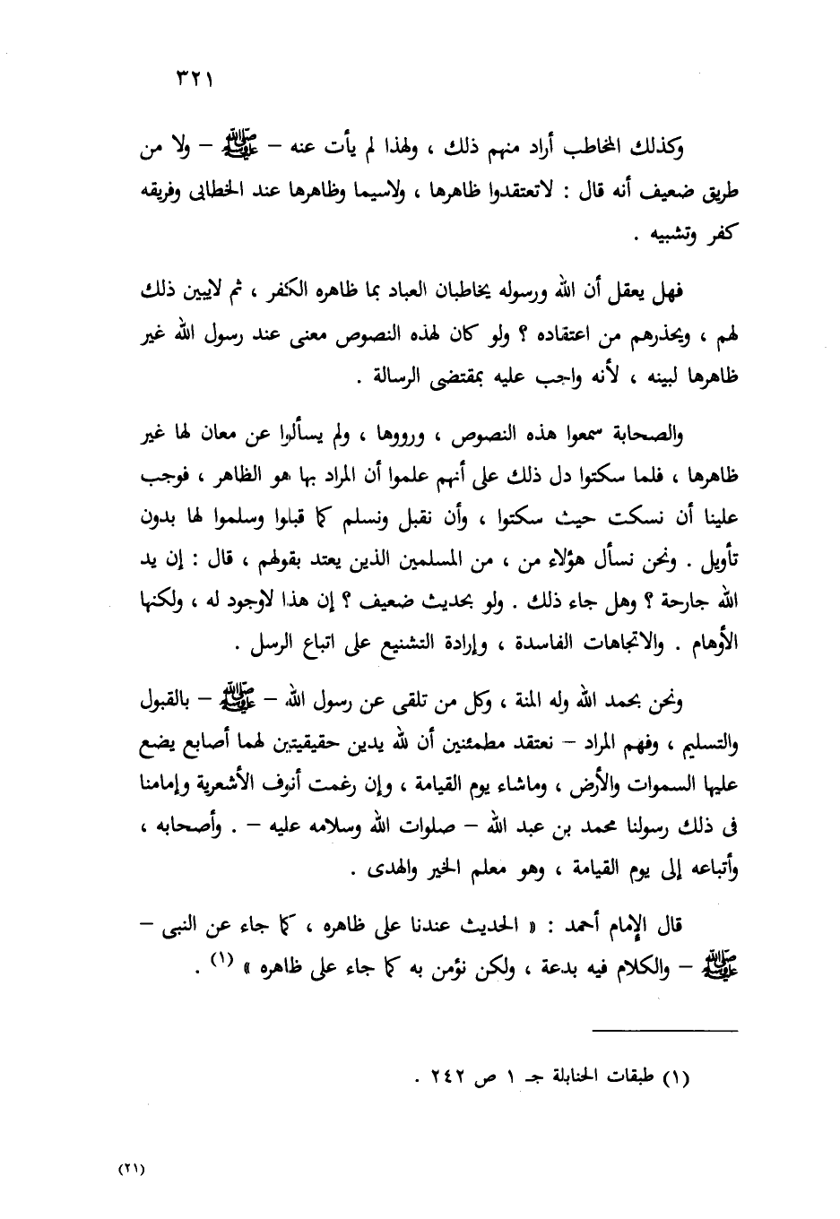 ونحن – بحمد الله وله المنة – وكل من تلقى عن رسول الله –صلى الله عليه وسلم- بالقبول والتسليم، وفهم المراد – نعتقد مطمئنين أن لله يدين حقيقتين لهما أصابع يضع عليها السموات والأرض وما شاء يوم القيامة، وإن زعمت أنوف الأشعرية، وإمامنا في ذلك رسولنا محمد بن عبد الله – صلوات الله وسلامه عليه – وأصحابه، وأتباعه إلى يوم القيامة، وهو معلم الخير والهدى