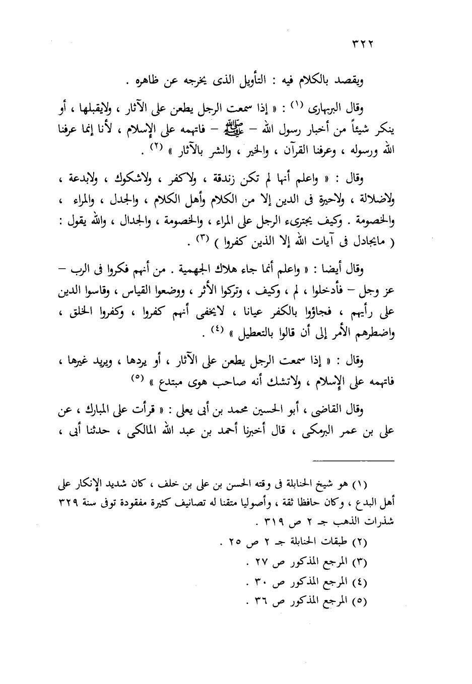 (¬1) هو شيخ الحنابلة في وقته الحسن بن علي بن خلف، كان شديد الإنكار على أهل البدع، وكان حافظاً ثقة، وأصولياً متقناً، له تصانيف كثيرة مفقودة، توفي سنة 329 "شذرات الذهب" (2/319)