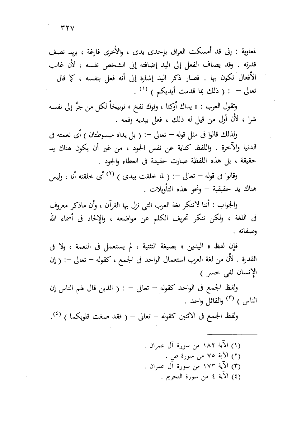 فإن لفظ "اليدين" بصيغة التثنية، لم يستعمل في النعمة، ولا في القدرة؛ لأن من لغة العرب استعمال الواحد في الجمع، كقوله –تعالى-: {إِنَّ الإِنسَانَ لَفِي خُسْرٍ} (¬3) .