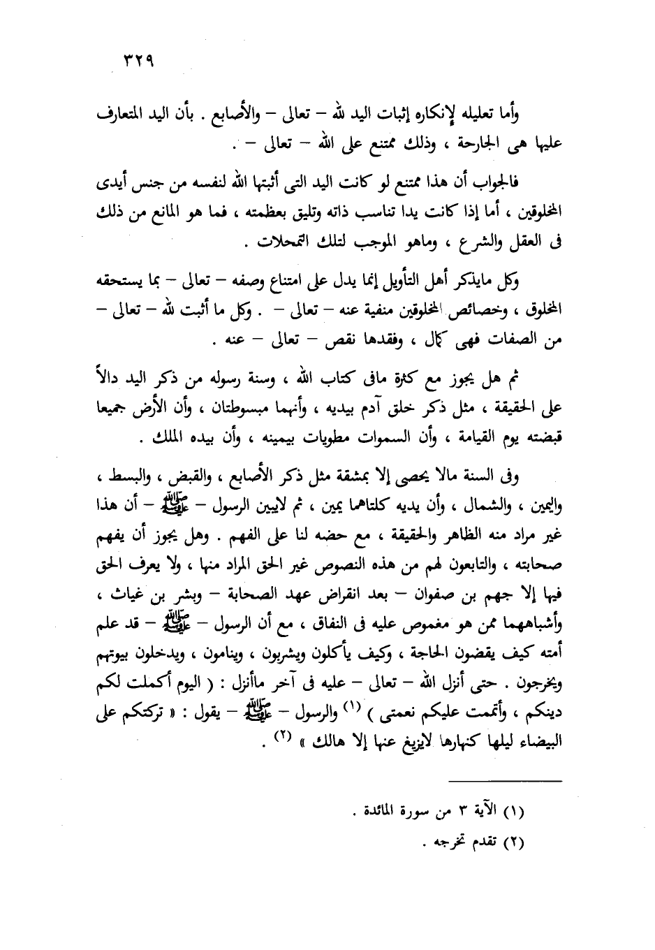 ثم هل يجوز مع كثرة ما في كتاب الله، وسنة رسوله، من ذكر اليد، دالاً على الحقيقة، مثل ذكر خلق آدم بيديه، وأنهما مبسوطتان، وأن الأرض جميعاً قبضته يوم القيامة، وأن السموات مطويات بيمينه، وأن بيده الملك، وفي السنة ما لا يحصى إلا بمشقة، مثل ذكر الأصابع، والقبض، والبسط، واليمين، والشمال، وأن يديه كلتاهما يمين، ثم لا يبين الرسول –صلى الله عليه وسلم- أن هذا غير مراد منه الظاهر والحقيقة، مع حضه لنا على الفهم؟ وهل يجوز أن يفهم صحابته والتابعون لهم من هذه النصوص غير الحق المراد منها، ولا يعرف الحق فيها إلا جهم بن صفوان – بعد انقراض عهد الصحابة – وبشر بن غياث- وأشباههما ممن هو مغموص عليه في النفاق؟ مع أن الرسول –صلى الله عليه وسلم- قد علم أمته كيف يقضون الحاجة، وكيف يأكلون ويشربون، وينامون، ويدخلون بيوتهم ويخرجون، حتى أنزل الله –تعالى- عليه في آخر ما أنزل: {الْيَوْمَ يَئِسَ الَّذِينَ كَفَرُواْ مِن دِينِكُمْ فَلاَ تَخْشَوْهُمْ وَاخْشَوْنِ الْيَوْمَ أَكْمَلْتُ لَكُمْ دِينَكُمْ وَأَتْمَمْتُ عَلَيْكُمْ نِعْمَتِي} (¬1) ، والرسول –صلى الله عليه وسلم- يقول: " تركتم على البيضاء ليلها كنهارها لا يزيغ عنها إلا هالك" (¬2) .