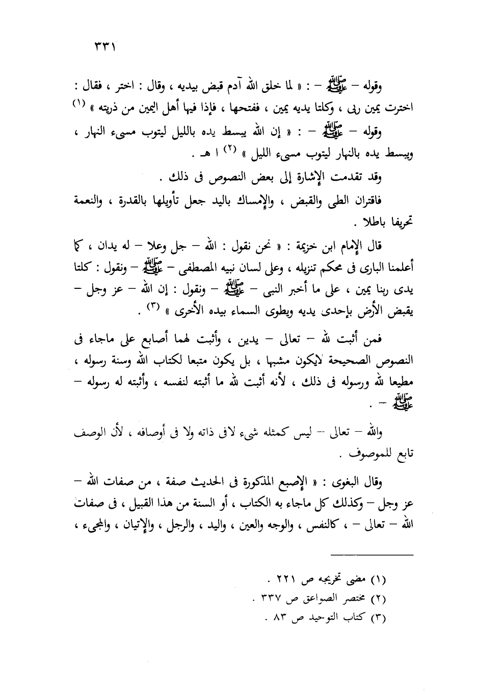 قال الإمام ابن خزيمة: " نحن نقول: الله – جل وعلا- له يدان، كما أعلمنا الباري في محكم تنزيله، وعلى لسان نبيه المصطفي –صلى الله عليه وسلم- ونقول: كلتا يدي ربنا يمين، على ما أخبر النبي –صلى الله عليه وسلم- ونقول: إن الله – عز وجل – يقبض الأرض بإحدى يديه، ويطوي السماء بيده الأخرى " (¬3) .