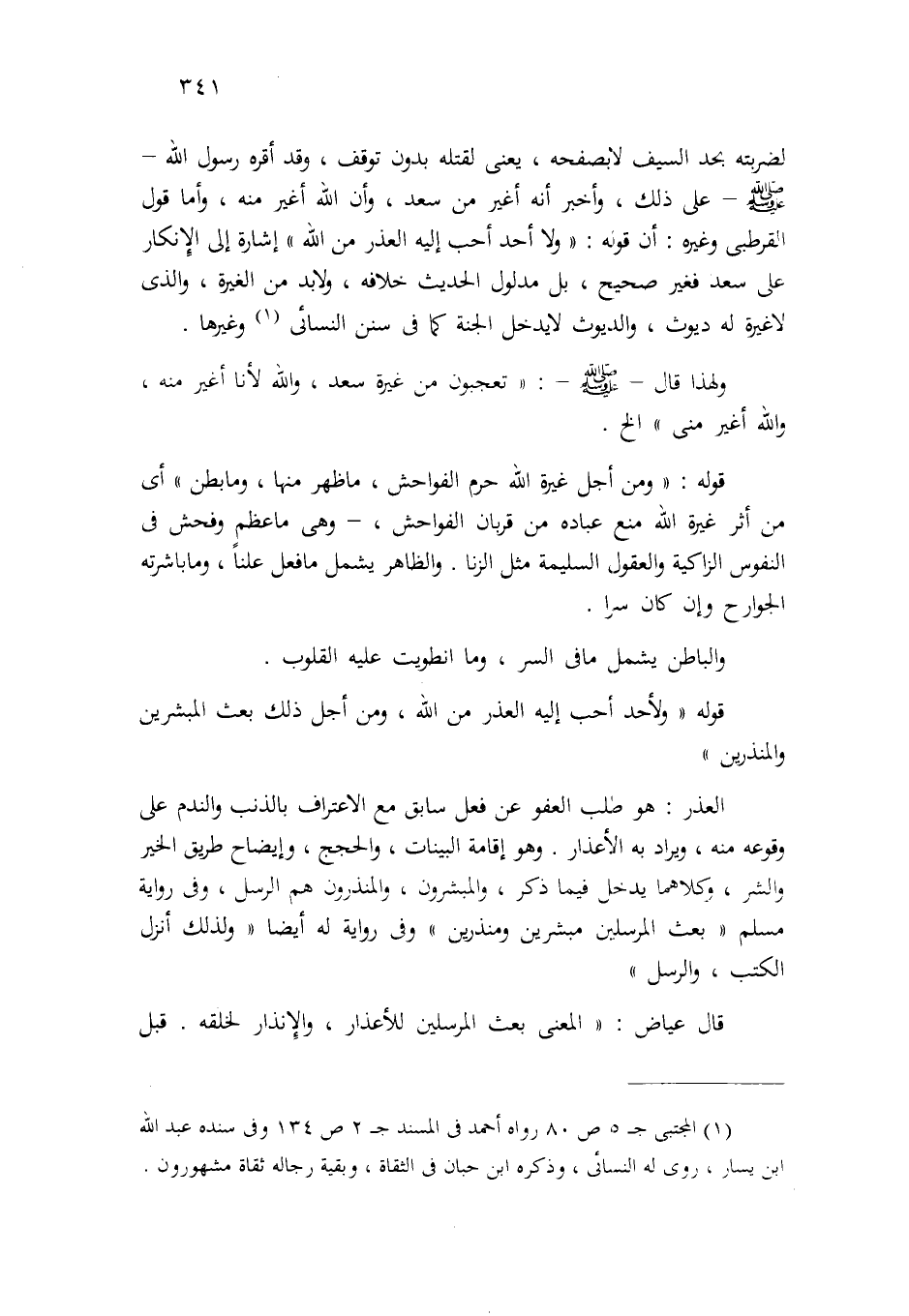 قوله: " ولا أحد أحب إليه العذر من الله، ومن أجل ذلك بعث المبشرين والمنذرين".