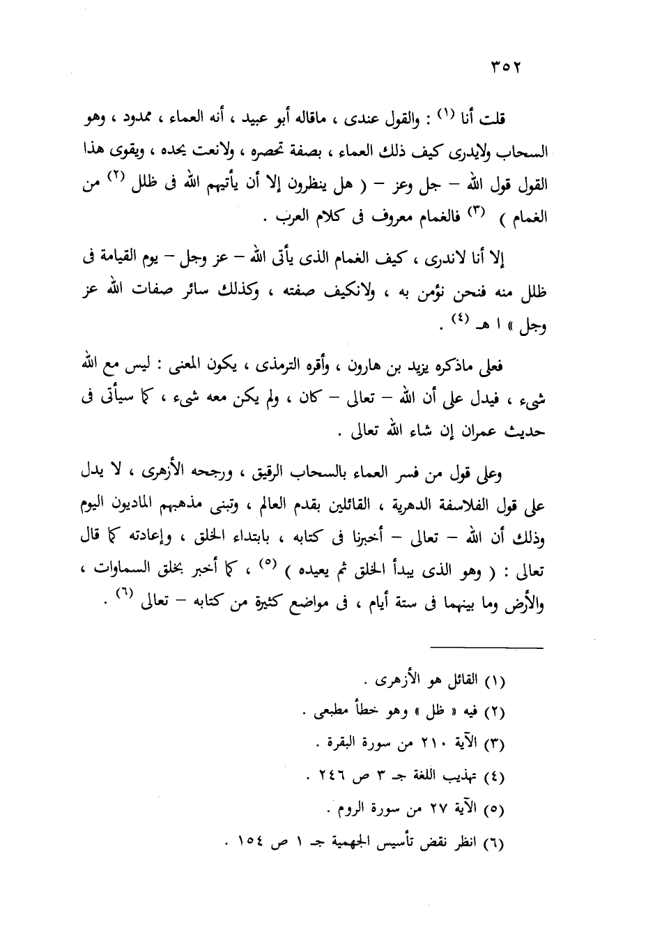 قلت أنا (¬1) : والقول عندي، ما قاله أبو عبيد، أنه العماء، ممدود، وهو السحاب، ولا يدري كيف ذلك العماء، بصفة تحصره، ولا نعت يحده، ويقوى هذا القول قول الله - جل وعز -: {هل ينظرون إلا أن يأتيهم الله في ظلل من الغمام} (¬2) فالغمام معروف في كلام العرب.
