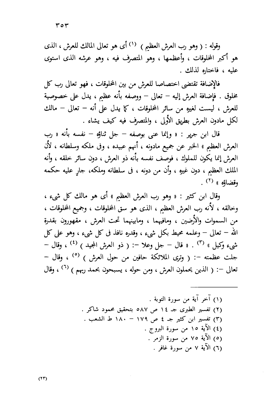 قال ابن جرير: " وإنما عنى بوصفه - جل ثناؤه - نفسه بأنه " رب العرش العظيم" الخبر عن جميع ما دونه، أنهم عبيده، وفي ملكه وسلطانه؛ لأن العرش إنما يكون للملوك، فوصف نفسه بأنه ذو العرش، دون سائر خلقه، وأنه الملك العظيم، دون غيره، وأن من دونه، في سلطانه وملكه، جار عليه حكمه وقضاؤه" (¬2) .