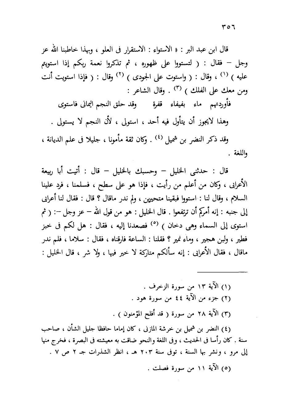 وقد ذكر النضر بن شميل -وكان ثقة مأموناً، جليلاً في علم الديانة، واللغة - قال: "حدثني الخليل - وحسبك بالخليل- قال: أتيت أبا ربيعة الأعرابي، وكان من أعلم من رأيت، فإذا هو على سطح، فسلمنا، فرد علينا السلام، وقال لنا: استووا، فبقينا متحيرين، ولم ندر ما قال؟ قال: فقال لنا أعرابي إلى جنبه، إنه أمركم أن ترتفعوا، قال الخليل: هو من قول الله - عز وجل -: {ثُمَّ اسْتَوَى إِلَى السَّمَاء وَهِيَ دُخَانٌ} (¬3) ، فصعدنا إليه، فقال: هل لكم في خبز فطير، ولبن هجير، وماء نمير؟ فقلنا: الساعة فارقناه، فقال: سلاماً، فلم ندر ما قال، فقال الأعرابي: إنه سألكم