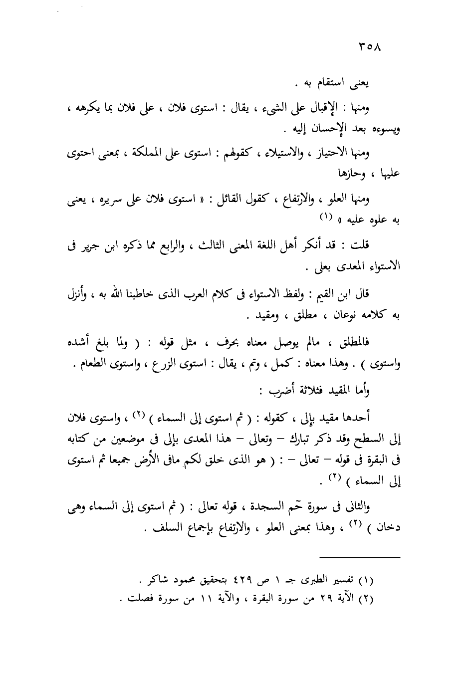 أحدها: مقيد بإلى، كقوله: {ثُمَّ اسْتَوَى إِلَى السَّمَاء} (¬2) ، واستوى فلان إلى السطح، وقد ذكر - تبارك وتعالى - هذا المعدى بإلى في موضعين من كتابه، في البقرة في قوله -تعالى-: {هُوَ الَّذِي خَلَقَ لَكُم مَّا فِي الأَرْضِ جَمِيعاً ثُمَّ اسْتَوَى إِلَى السَّمَاء} ، والثاني في سورة حم السجدة، قوله تعالى: {ثُمَّ اسْتَوَى إِلَى السَّمَاء وَهِيَ دُخَانٌ} وهذا بمعنى العلو والارتفاع، بإجماع السلف.
