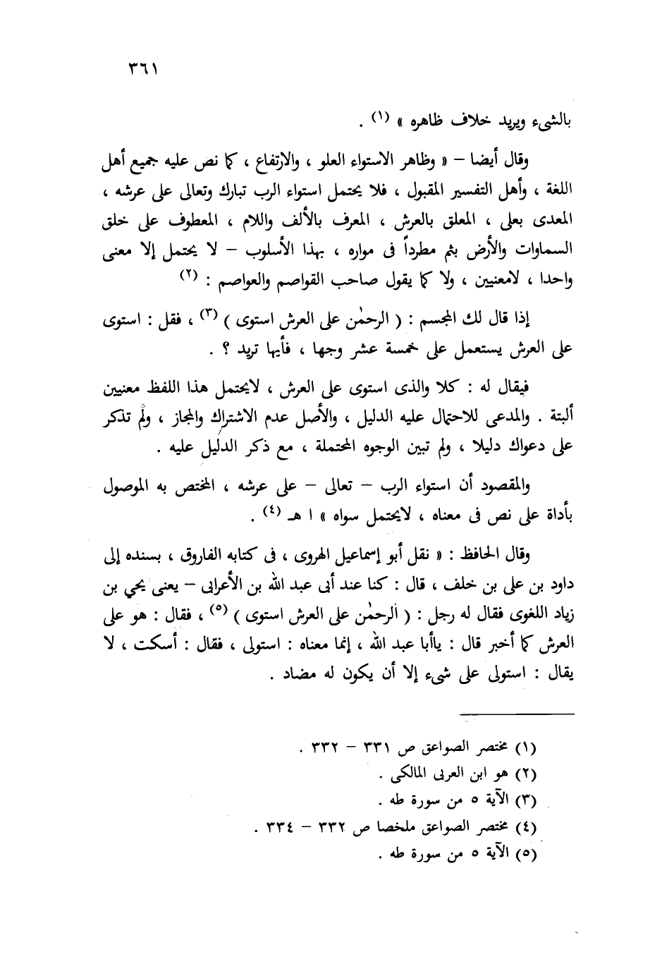 وقال - أيضاً-: " وظاهر الاستواء: العلو، والارتفاع، كما نص عليه جميع أهل اللغة، وأهل التفسير المقبول، فلا يحتمل استواء الرب - تبارك وتعالى - على عرشه المعدى بعلى، المعلق بالعرش، المعرف بالألف واللام، المعطوف على خلق السماوات والأرض بثم مطرداً في " موارده" بهذا الأسلوب، لا يحتمل إلا معنى واحداً، لا معنيين، ولا كما يقول صاحب "العواصم والقواصم" (¬2) :