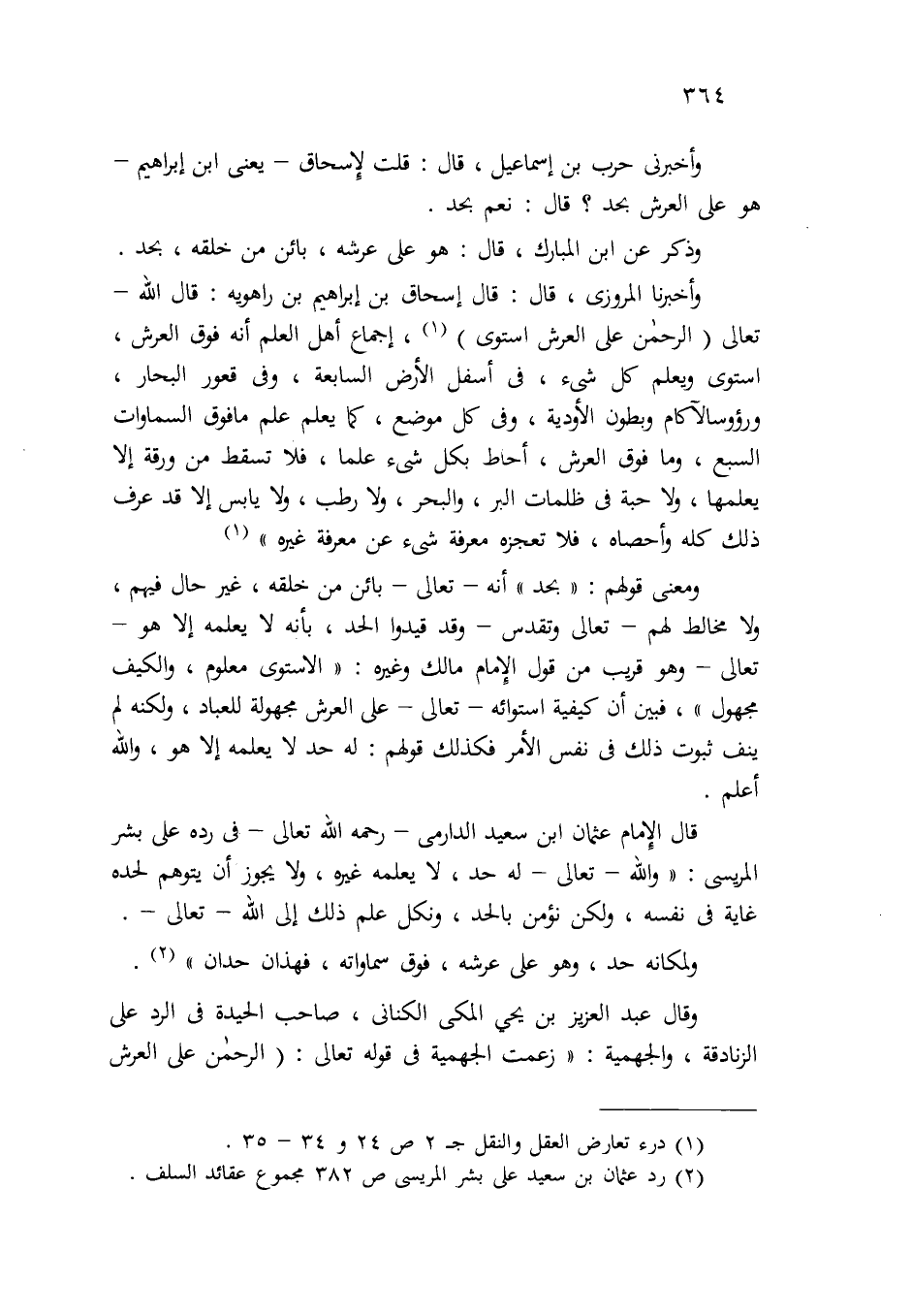 وأخبرني حرب بن إسماعيل، قال: قلت لإسحاق - يعني ابن إبراهيم - هو على العرش بحد؟ قال: نعم بحد.