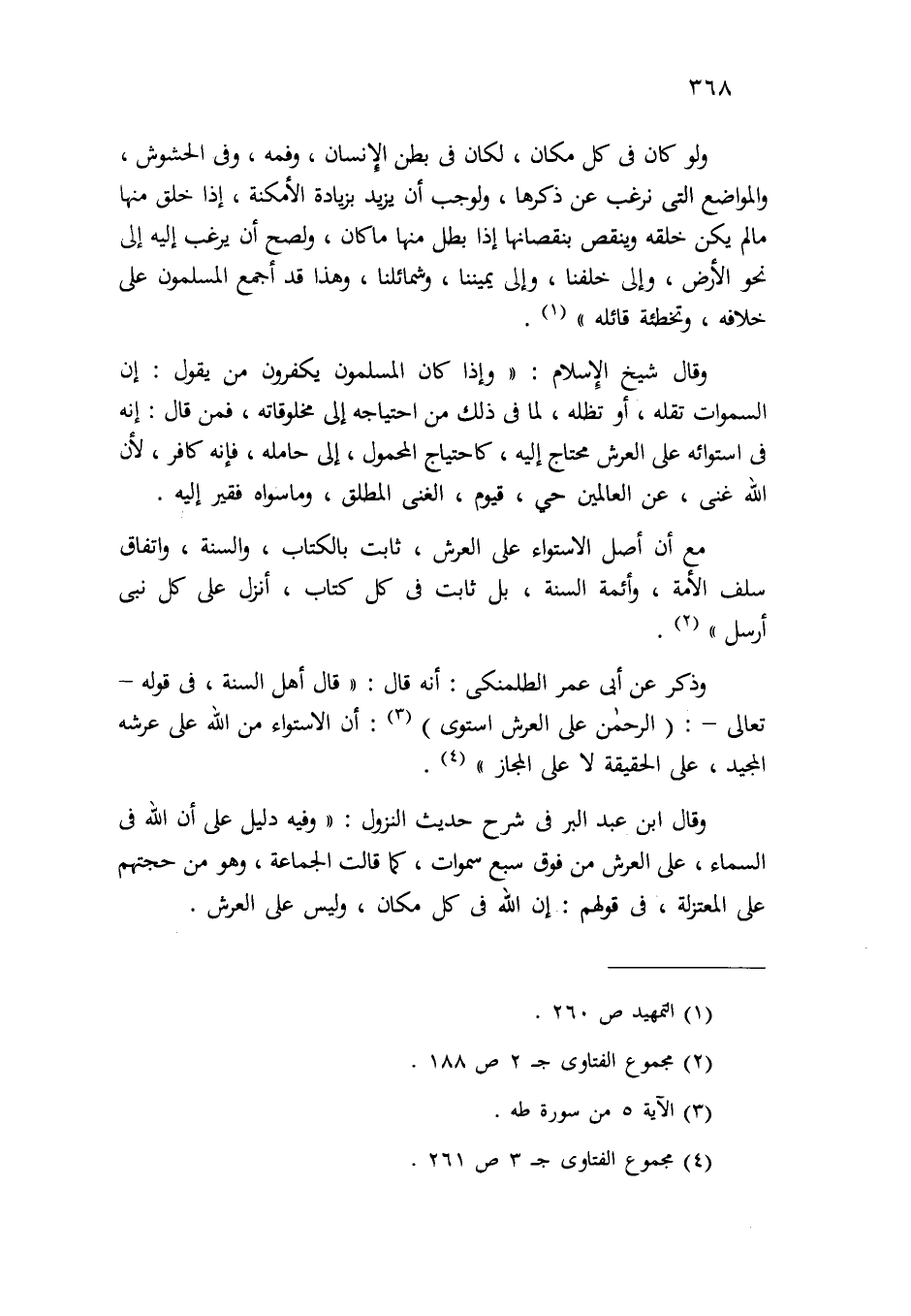 مع أن أصل الاستواء على العرش، ثابت بالكتاب، والسنة، واتفاق سلف الأمة، وأئمة السنة، بل ثابت في كل كتاب، أنزل على كل نبي أرسل" (¬2)