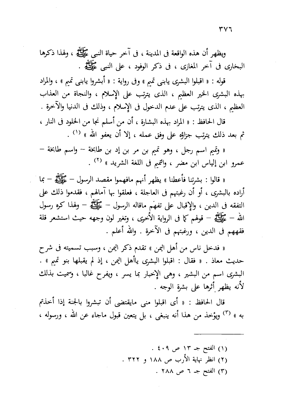 "وتميم: اسم رجل، وهو تميم بن مر بن إد بن طابخة - واسم طابخة- عمرو بن إلياس بن مضر، والتميم في اللغة: الشريد" (¬2) . " قالوا: بشرتنا فأعطنا" يظهر أنهم ما فهموا مقصد الرسول -صلى الله عليه وسلم- بما أراده بالبشرى، أو أن رغبتهم في العاجلة، فعلقوا بها آمالهم، فقدموا ذلك على التفقه في الدين، والإقبال على تفهم ما قاله الرسول - صلى الله عليه وسلم -، ولهذا كره رسول الله -صلى الله عليه وسلم- قولهم، كما في الرواية الأخرى، وغير لون وجهه حيث استشعر قلة فقههم في الدين، ورغبتهم في الآخرة، والله أعلم.