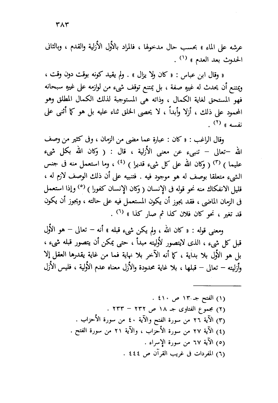 "وقال ابن عباس: "كان ولا يزال" ولم يقيد كونه بوقت دون وقت، ويمتنع أن يحدث له غيره، صفة، بل يمتنع توقف شيء من لوازمه على غيره - سبحانه- فهو المستحق لغاية الكمال، وذاته هي المستوجبة لذلك الكمال المطلق، وهو المحمود على ذلك، أزلاً وأبداً، ولا يحصي الخلق ثناء عليه بل هو كما أثنى على نفسه" (¬2) .