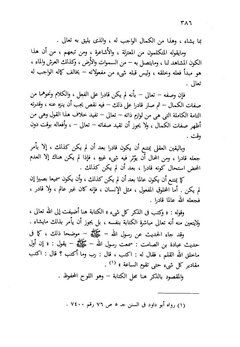 فإنه وصفه -تعالى- بأنه لم يكن قادراً على الفعل والكلام ونحوهما من صفات الكمال، ثم صار قادراً على ذلك، فيه نقص يجب أن ينزه عنه، وقدرته التامة الكاملة التي هي من لوازم ذاته -تعالى- تفيد خلاف هذا القول، وهي من أظهر صفات الكمال، ولا يجوز أن تقيد صفاته -تعالى- وأفعاله بوقت دون وقت.