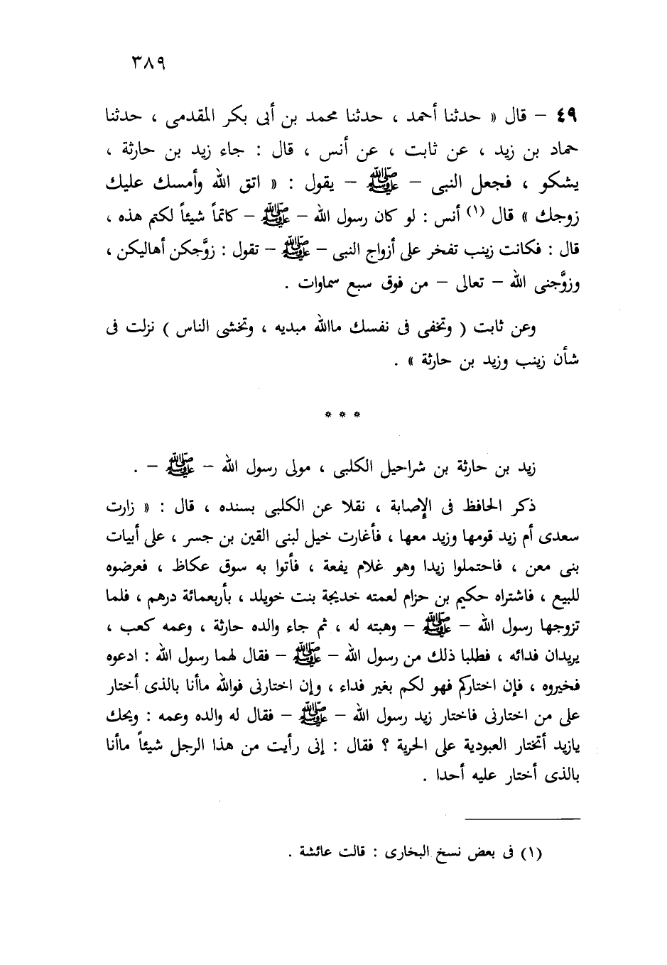 49-قال: " حدثنا أحمد، حدثنا محمد بن أبي بكر المقدمي، حدثنا حماد بن زيد، عن ثابت، عن أنس، قال: جاء زيد بن حارثة، يشكو، فجعل النبي -صلى الله عليه وسلم- يقول: " اتق الله وأمسك عليك زوجك" قال (¬1) أنس: لو كان رسول الله -صلى الله عليه وسلم- كاتماً شيئاً لكتم هذه، قال: فكانت زينب تفخر على أزواج النبي -صلى الله عليه وسلم- تقول: زوجكن أهاليكن، وزوجني الله -تعالى- من فوق سبع سماوات".