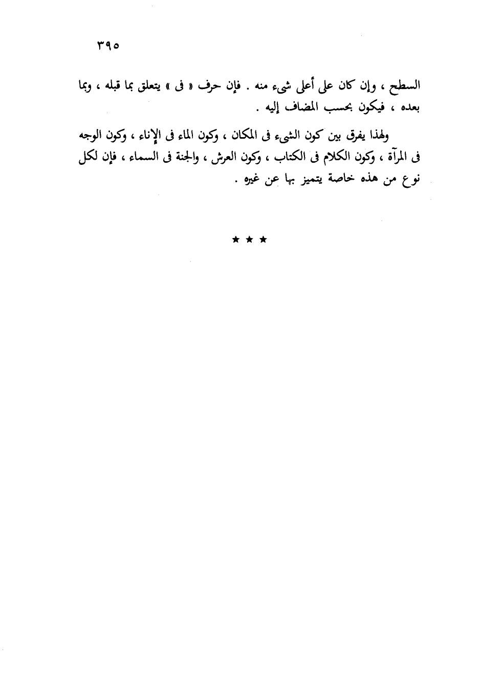 ولهذا يفرق بين كون الشيء في المكان، وكون الماء في الإناء، وكون الوجه في المرآة، وكون الكلام في الكتاب، وكون العرش والجنة في السماء، فإن لكل نوع من هذه خاصة يتميز بها عن غيره.