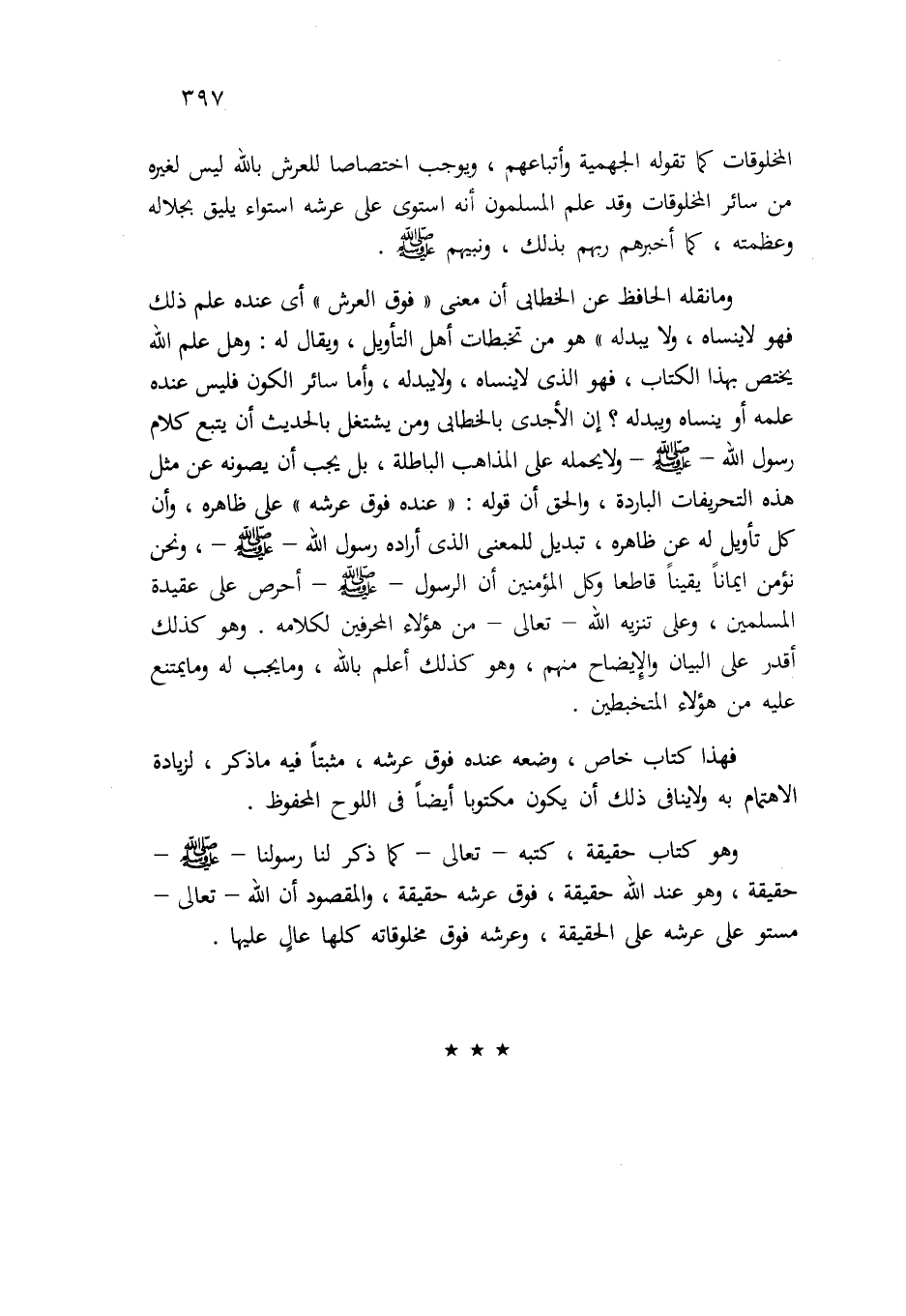 وما نقله الحافظ عن الخطابي أن معنى "فوق العرش" أي: " عنده علم ذلك فهو لا ينساه، ولا يبدله" هو من تخبطات أهل التأويل، ويقال له: وهل علم الله يختص بهذا الكتاب، فهو الذي لا ينساه، ولا يبدله، وأما سائر الكون فليس عنده علمه أو ينساه ويبدله؟ إن الأجدى بالخطابي ومن يشتغل بالحديث أن يتبع كلام رسول الله -صلى الله عليه وسلم- ولا يحمله على المذاهب الباطلة، بل يجب أن يصونه عن مثل هذه التحريفات الباردة. والحق أن قوله: "عنده فوق عرشه" على ظاهره، وأن كل تأويل له عن ظاهره، تبديل للمعنى الذي أراده رسول الله -صلى الله عليه وسلم-، ونحن نؤمن إيماناً يقيناً قاطعاً - وكل المؤمنين- أن الرسول -صلى الله عليه وسلم- أحرص على عقيدة المسلمين، وعلى تنزيه الله -تعالى- من هؤلاء المحرفين لكلامه، وهو كذلك أقدر على البيان والإيضاح منهم، وهو كذلك أعلم بالله، وما يجب له وما يمتنع عليه من هؤلاء المتخبطين.