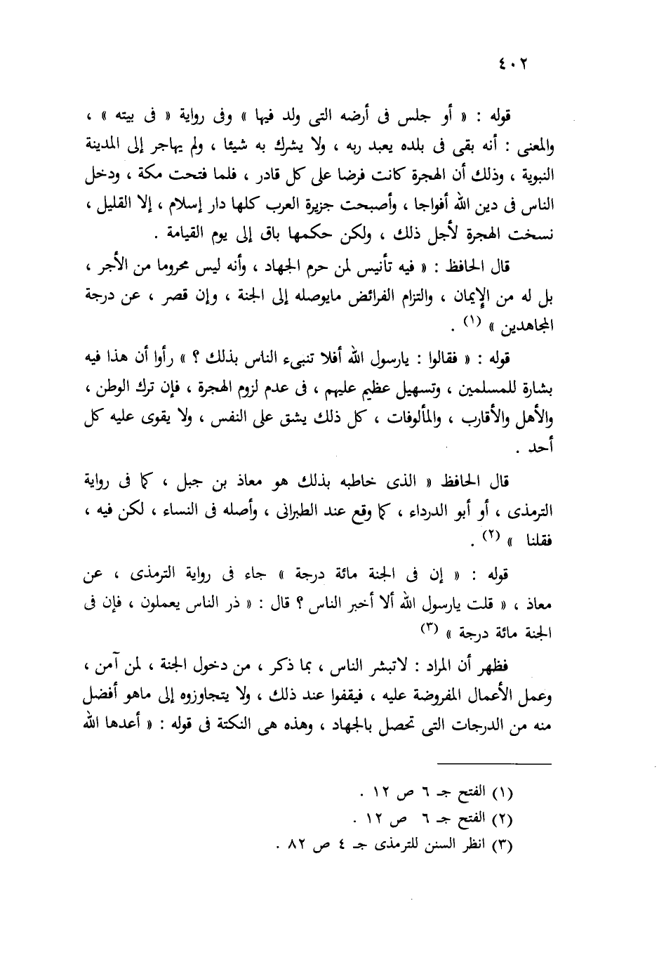 قوله: " إن في الجنة مائة درجة " جاء في رواية الترمذي، عن معاذ، " قلت: يا رسول الله، ألا أخبر الناس؟ قال: " ذر الناس يعملون، فإن في الجنة مائة درجة" (¬3) .