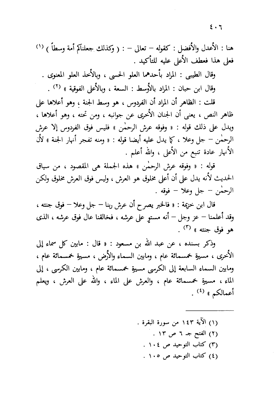 قال ابن خزيمة: " فالخبر يصرح أن عرش ربنا - جل وعلا - فوق جنته، وقد أعلمنا - عز وجل - أنه مستوٍ على عرشه، فخالقنا عالٍ فوق عرشه، الذي هو فوق جنته" (¬3)