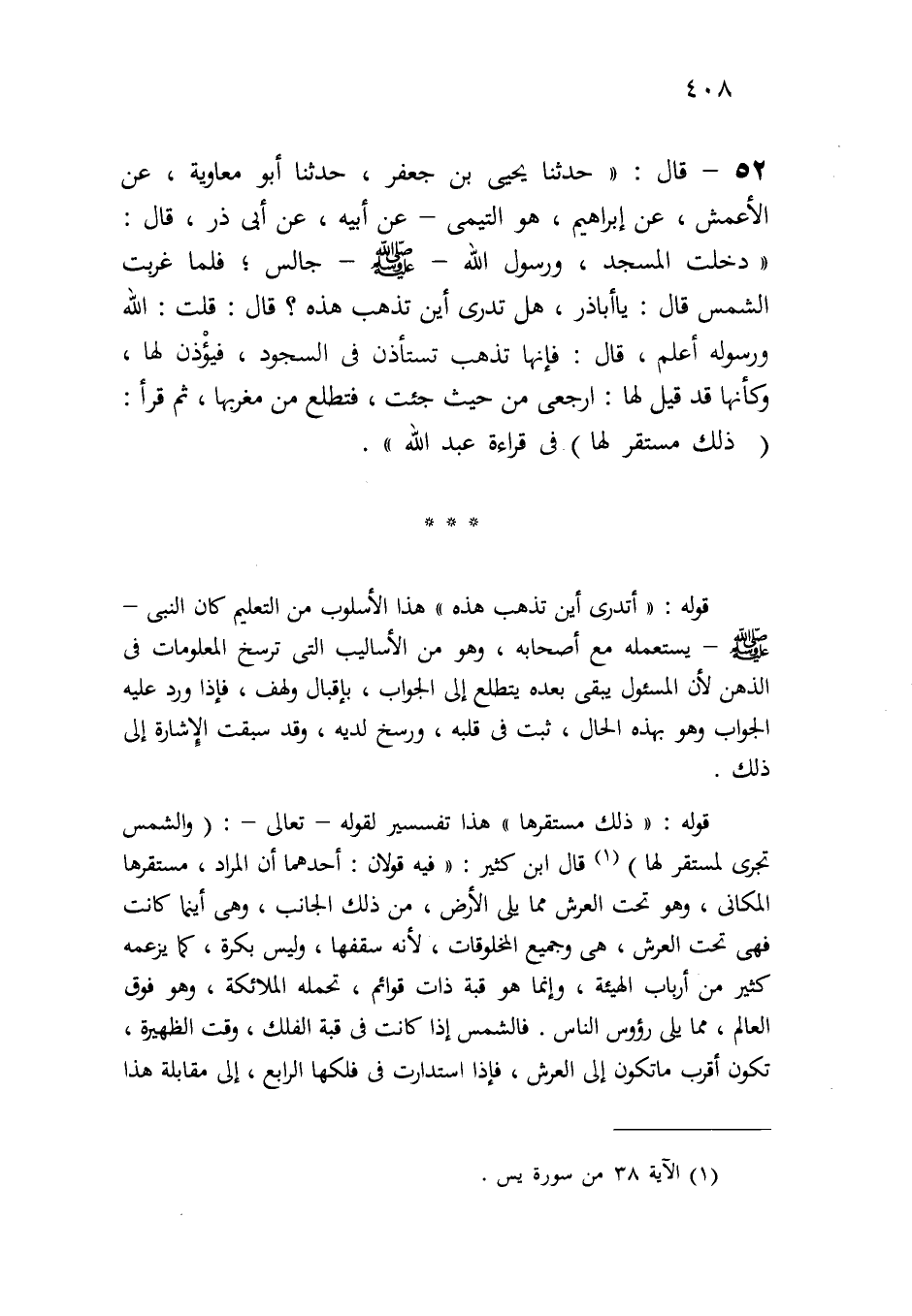 52-قال: " حدثنا يحيى بن جعفر، حدثنا أبو معاوية، عن الأعمش، عن إبراهيم - هو التيمي - عن أبيه، عن أبي ذر، قال: " دخلت المسجد، ورسول الله -صلى الله عليه وسلم- جالس؛ فلما غربت الشمس قال: يا أبا ذر، هل تدري أين تذهب هذه؟ قال: قلت: الله ورسوله أعلم، قال: فإنها تذهب تستأذن في السجود، فيؤذن لها، وكأنها قد قيل لها: ارجعي من حيث جئت، فتطلع من مغربها، ثم قرأ: (ذلك مستقر لها) في قراءة عبد الله".
