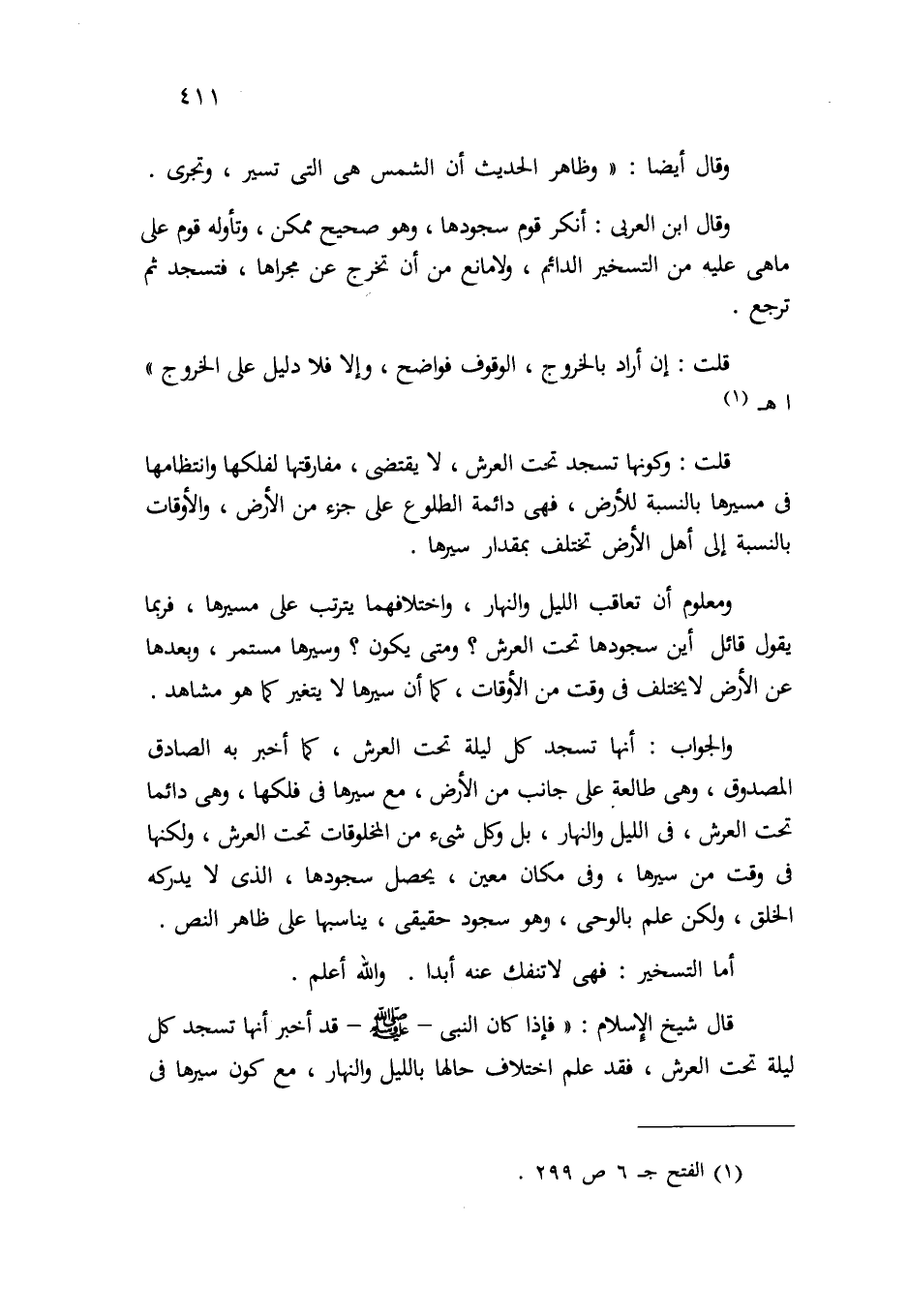 قلت: وكونها تسجد تحت العرش لا يقتضي مفارقتها لفلكها وانتظامها في مسيرها بالنسبة للأرض، فهي دائمة الطلوع على جزء من الأرض، والأوقات بالنسبة إلى أهل الأرض تختلف بمقدار سيرها.