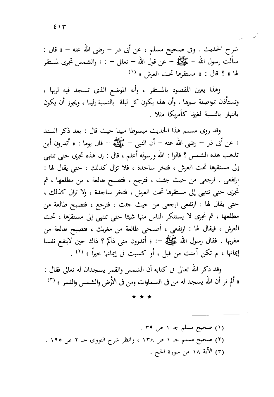 وفي "صحيح مسلم"، عن أبي ذر - رضي الله عنه - قال: سألت رسول الله -صلى الله عليه وسلم- عن قول الله -تعالى-: {وَالشَّمْسُ تَجْرِي لِمُسْتَقَرٍّ لَّهَا} قال: " مستقرها تحت العرش" (¬1) .