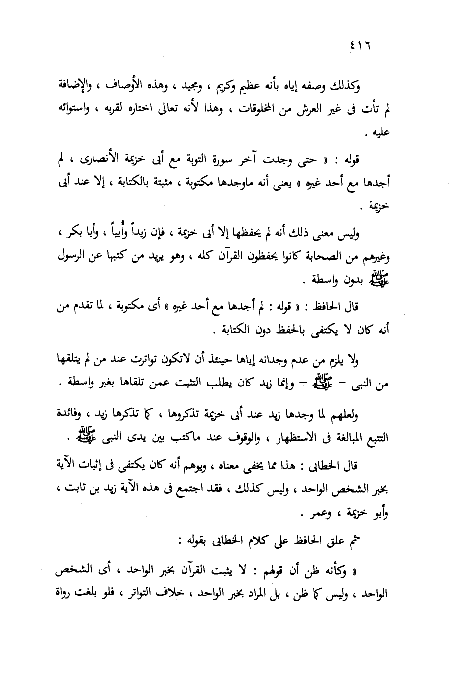 قوله: " حتى وجدت آخر سورة التوبة مع أبي خزيمة الأنصاري، لم أجدها مع أحد غيره" يعني: أنه ما وجدها مكتوبة، مثبتة بالكتابة، إلا عند أبي خزيمة.