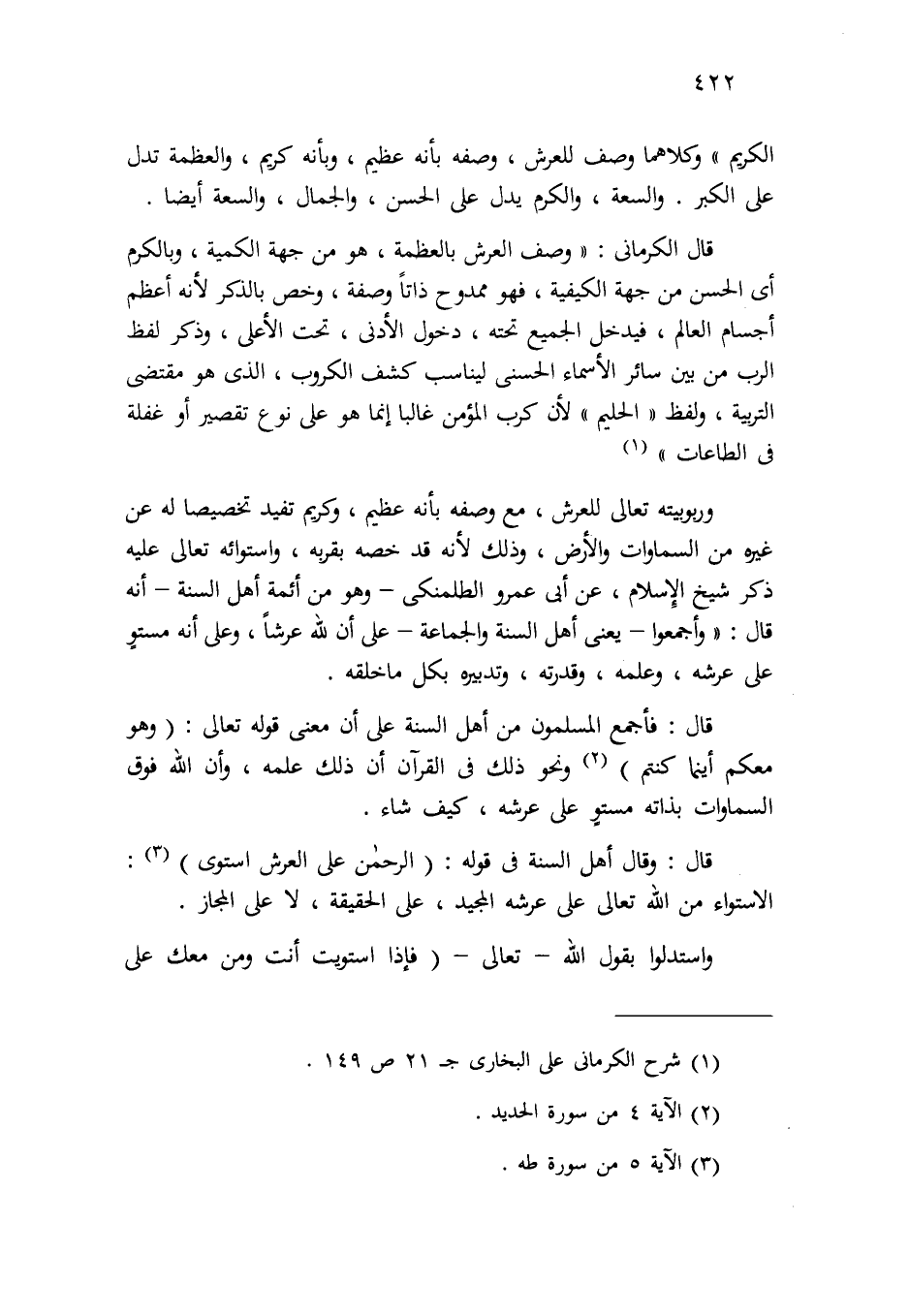 قال: فأجمع المسلمون من أهل السنة على أن معنى قوله تعالى: {وَهُوَ مَعَكُمْ أَيْنَ مَا كُنتُمْ} (¬2) ، ونحو ذلك في القرآن أن ذلك علمه، وأن الله فوق السماوات بذاته مستو على عرشه، كيف شاء. قال: وقال أهل السنة في قوله: {الرَّحْمَنُ عَلَى الْعَرْشِ اسْتَوَى} (¬3) : الاستواء من الله -تعالى- على عرشه المجيد، على الحقيقة، لا على المجاز. واستدلوا بقول الله -تعالى-: {فإذا استويت أنت ومن معك على